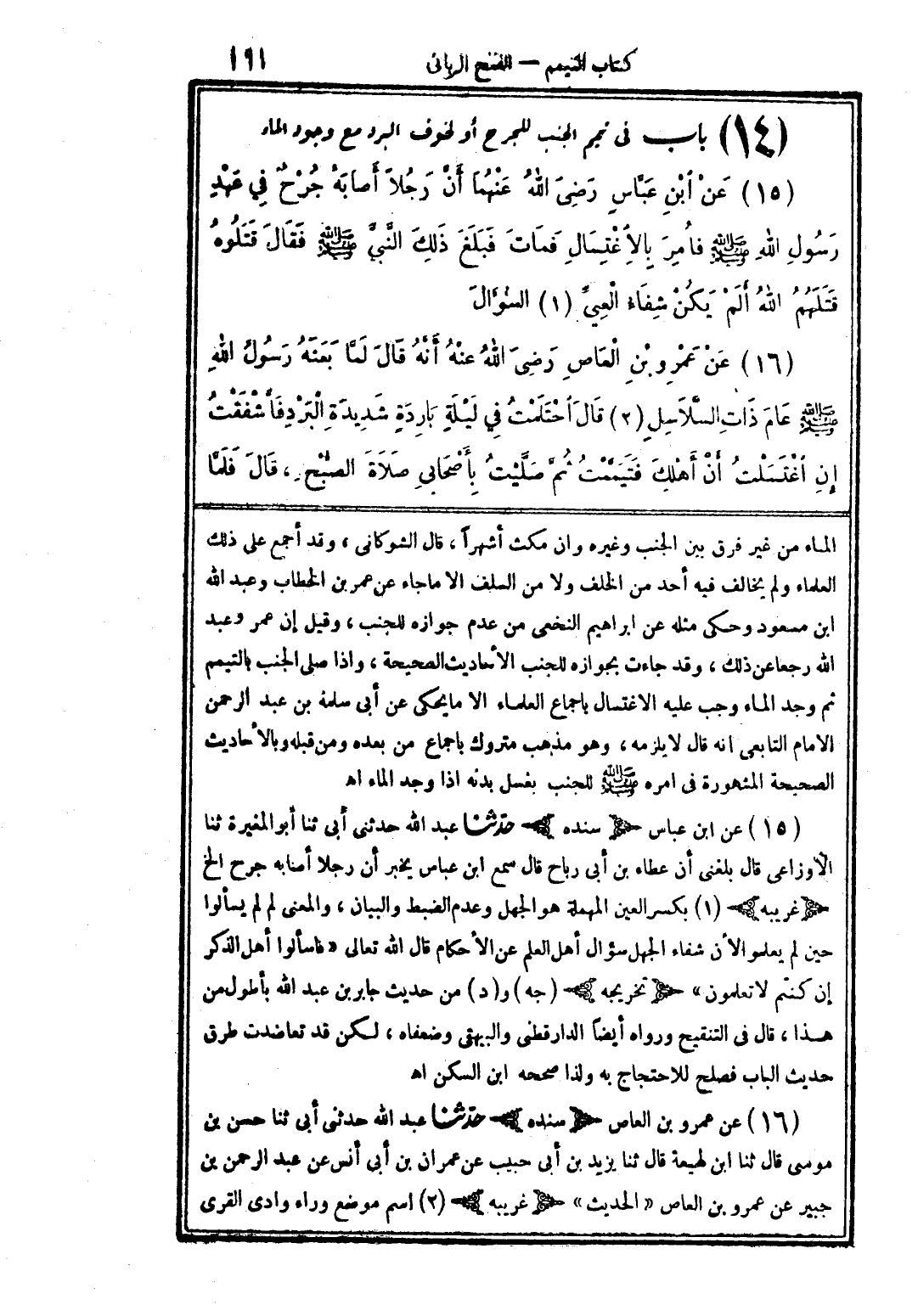 (16) عن عمرو بن العاص رضى الله عنه أنَّه قال لمَّا بعثه رسول الله صلى الله عليه وسلم عام ذات السَّلاسل قال احتلمت في ليلة باردةٍ شديدة البرد فأشفقت إن اغتسلت أن أهلك فتيمَّمت ثمَّ صلَّيت بأصحابى صلاة الصُّبح، قال فلمَّا