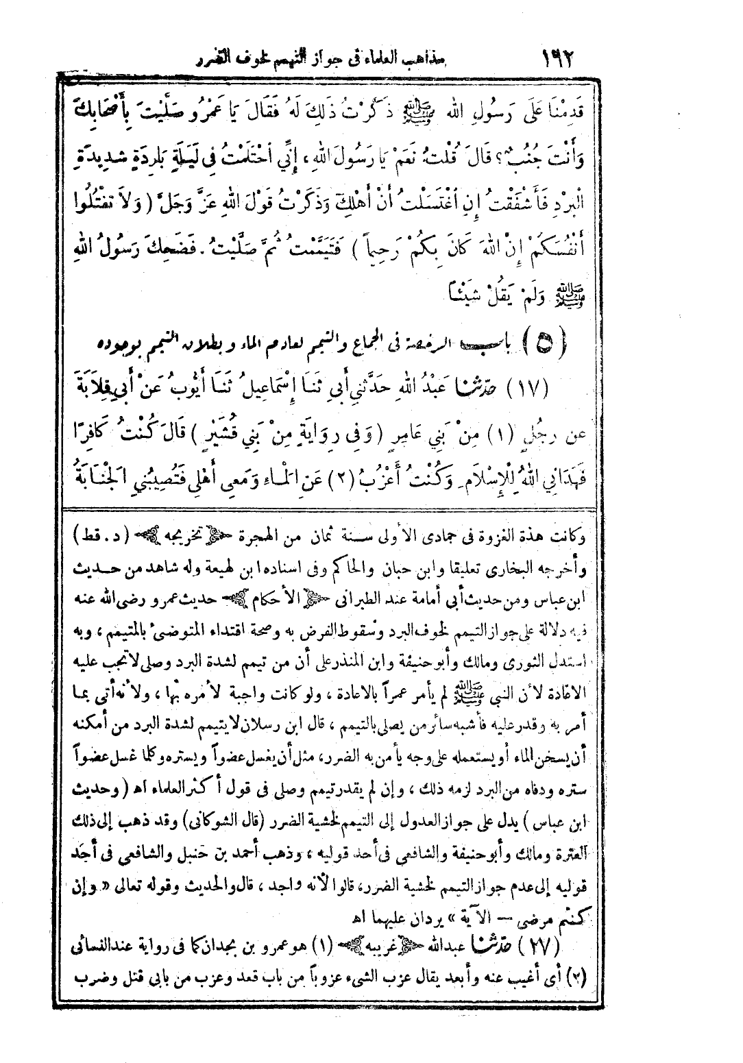 الأولى سنة ثمان من الهجرة (تخرجه) (د. قط) وأخرجه البخاري تعليقًا وابن حبان والحاكم وفى اسناده ابن لهيعة وله شاهد من حديث ابن عباس ومن حديث أبى أمامة عند الطبراني (الأحكام) حديث عمرو رضى الله عنه فيه دلالة على جواز التيمم لخوف البرد وسقوط الفرض به وصحة اقتداء المتوضئ بالمتيمم، وبه استدل الثوري ومالك وأبو حنيفة وابن المنذر على أن من تيمم لشدة البرد وصلى لا تجب عليه الإعادة لأن النبى صلى الله عليه سلم لم يأمر عمرًا بالإعادة، ولو كانت واجبة لأمره بها، ولأنه أتى بما أمر به وقدر عليه فأشبه سائر من يصلى بالتيمم، قال ابن رسلان لا يتيمم لشدة البرد من أمكنه أن يسخن الماء أو يستعمله على وجه يأمن به الضرر، مثل أن يغسل عضوًا ويستره وكلما غسل عضوًا ستره ودفاه من البرد لزمه ذلك، وإن لم يقدر تيمم وصلى فى قول أكثر العلماء اهـ (وحديث ابن عباس) يدل على جواز العدول إلى التيمم لخشية الضرر (قال الشوكاني) وقد ذهب إلى ذلك العترة ومالك وأبو حنيفة والشافعي في أحد قوليه، وذهب أحمد بن حنبل والشافعي في أحد قوليه إلى عدم جواز التيمم لخشية الضرر، قالوا لأنه واجد، قال الحديث وقوله تعالى" وإن كنتم مرضى- الآية" يردان عليهما اهـ
