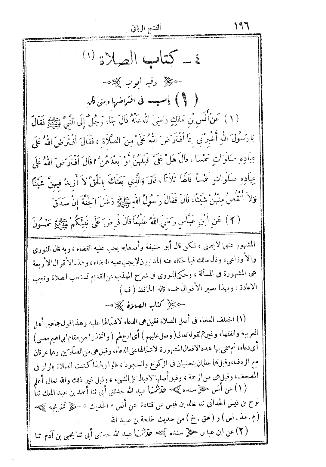 (1) عن أنس بن مالك رضى الله عنه قال جاء رجلٌ إلى النَّبيِّ صلى الله عليه وسلم فقال يا رسول الله أخبرنى بما افترض الله علىَّ من الصَّلاة، فقال أفترض الله على عباده صلواتٍ خمسًا، قال هل علىَّ قبلهنَّ أو بعدهنَّ؟ قال أفترض الله على عباده صلواتٍ خمسًا قالها ثلاثًا، قال والَّذي بعثك بالحقِّ لا أزيد فيهنَّ شيئًا ولا أنقص منهنَّ شيئًا، قال فقال رسول الله صلى الله عليه وسلم دخل الجنَّة إن صدق