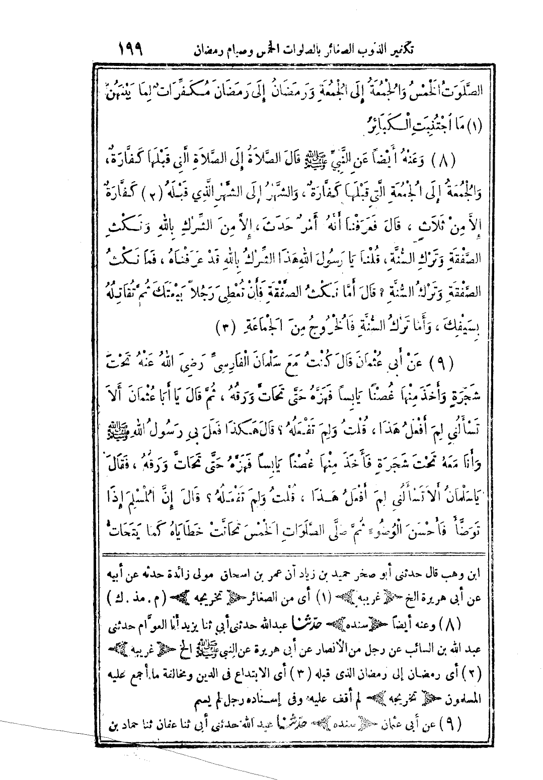 (8) وعنه أيضًا عن النَّبيِّ صلى الله عليه وسلم قال الصَّلاة إلى الصَّلاة الَّتى قبلها كفَّارة، ولجمعة إلى الجمعة الَّتى قبلها كفَّارة، والشَّهر إلى الشَّهر الَّذي قبله كفَّارةٌ إلاَّ من ثلاثٍ، قال فعرفنا أنَّه أمرٌ حدث، إلاَّ من الشرك بالله ونكث الصَّفقة وترك السُّنَّة، قلنا يا رسول الله هذا الشِّرك بالله قد عرفناه، فما نكث الصَّفقة وترك السُّنَّة؟ قال أمَّا نكث الصَّفقة فأن تعطى رجلًا بيعتك ثمَّ تقاتله بسيفك، وأما ترك السُّنَّة فالخروج من الجماعة