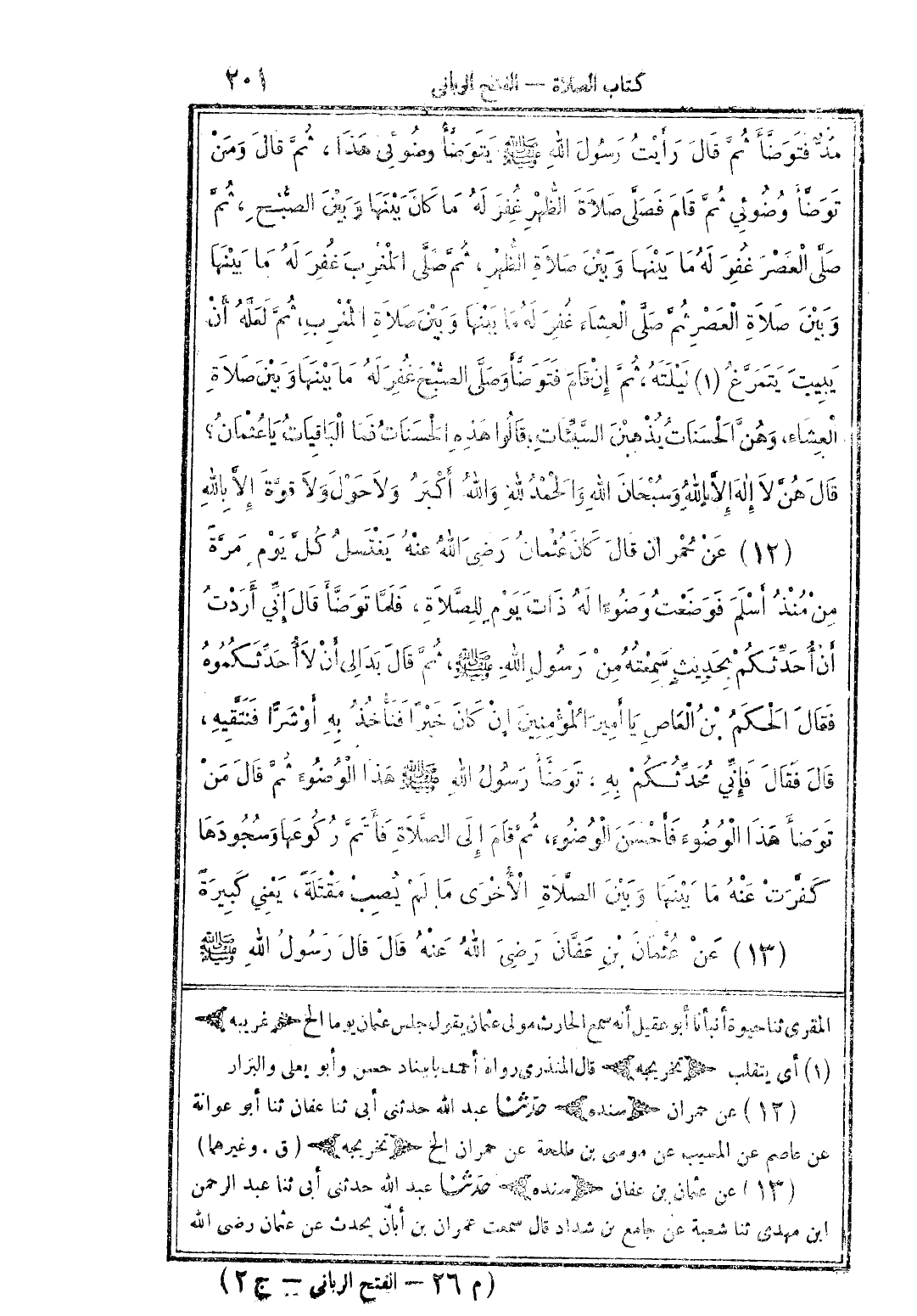 (12) عن حمران قال كان عثمان رضى الله عنه يغتسل كلَّ يوم مرَّة من منذ أسلم فوضعت وضوءًا له ذات يوم للصَّلاة، فلمَّا توضَّأ قال إنِّي أردت أن أحدِّثكم بحديثٍ سمعته من رسول الله صلى الله عليه وسلم، ثمَّ قال بدا لى أن لا أحدِّثكموه فقال الحكم بن العاص يا أمير المؤمنين إن كان خيرًا فنأخذ به أو شرًّا فنتَّقيه، قال فقال فإنِّي محدِّثكم به، توضَّأ رسول الله صلى الله عليه وسلم هذا الوضوء ثمَّ قال من توضأ هذا الوضوء فأحسن الوضوء، ثمَّ قام إلى الصَّلاة فأتمَّ ركوعها وسجودها كفَّرت عنه ما بينها وبين الصَّلاة الأخرى ما لم يصب مقتلةً، يعنى كبيرةً