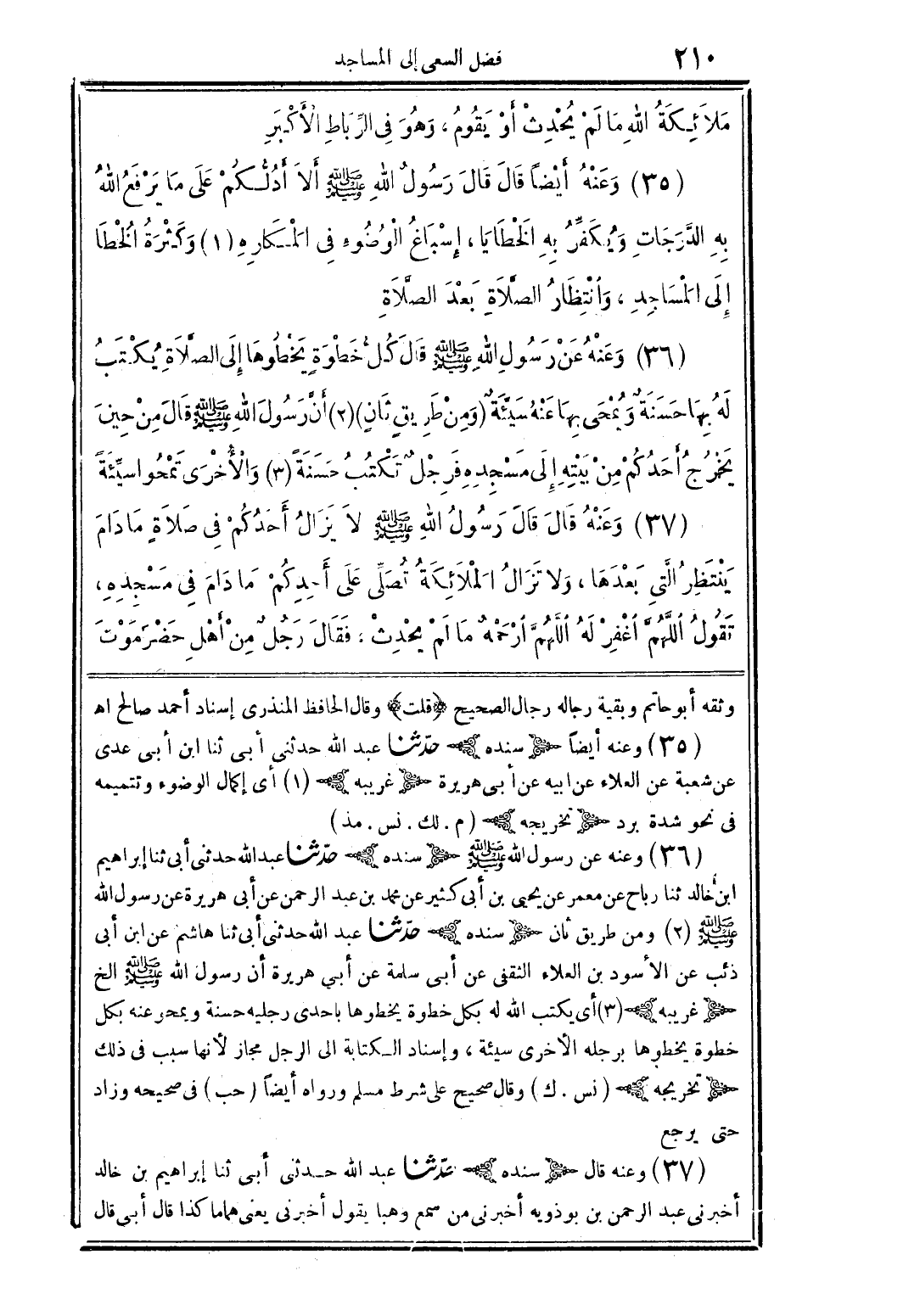 (35) وعنه أيضًا قال قال رسول الله صلى الله عليه وسلم ألا أدلُّكم على ما يرفع الله به الدَّرجات ويكفِّر به الخطايا، إسباغ الوضوء فى المكاره وكثرة الخطا إلى المساجد، وانتظار الصَّلاة بعد الصَّلاة
