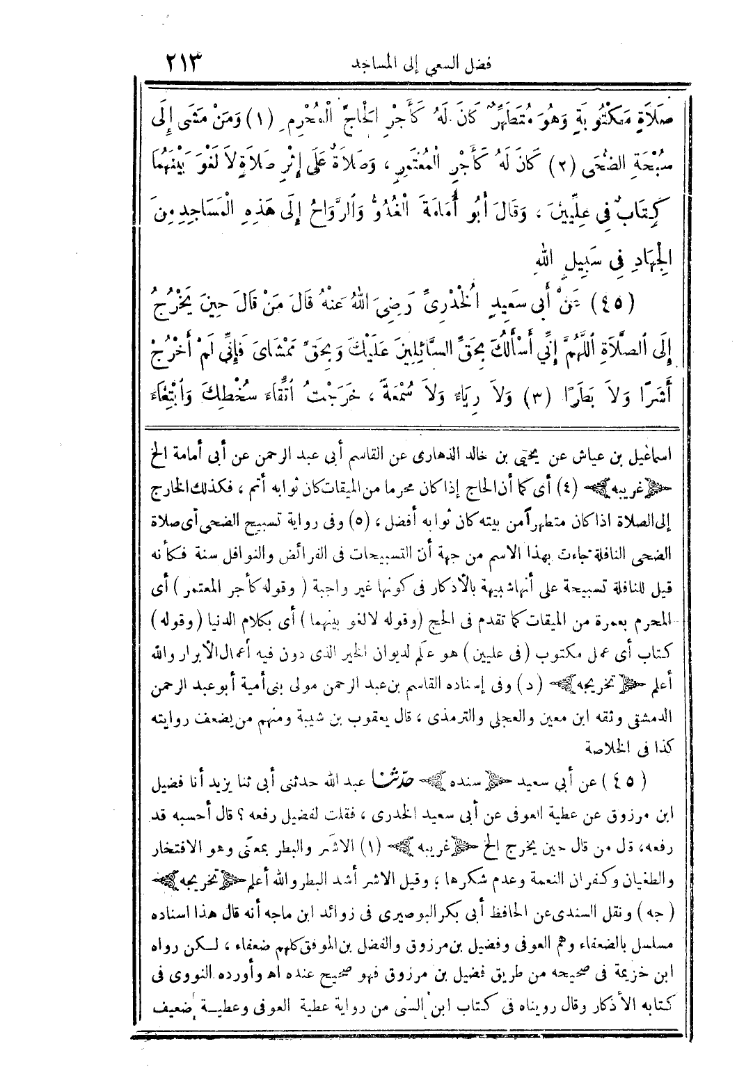(45) عن أبى سعيد الخدرىِّ رضى الله عنه قال من قال حين يخرج إلى الصَّلاة اللَّهمَّ إنِّي أسألك بحقِّ السَّائلين عليك وبحقِّ ممشاى فإنِّى لم أخرج أشرًا ولا بطرًا ولا رياء ولا سمعةً، خرجت اتِّقاء سخطك وابتغاء