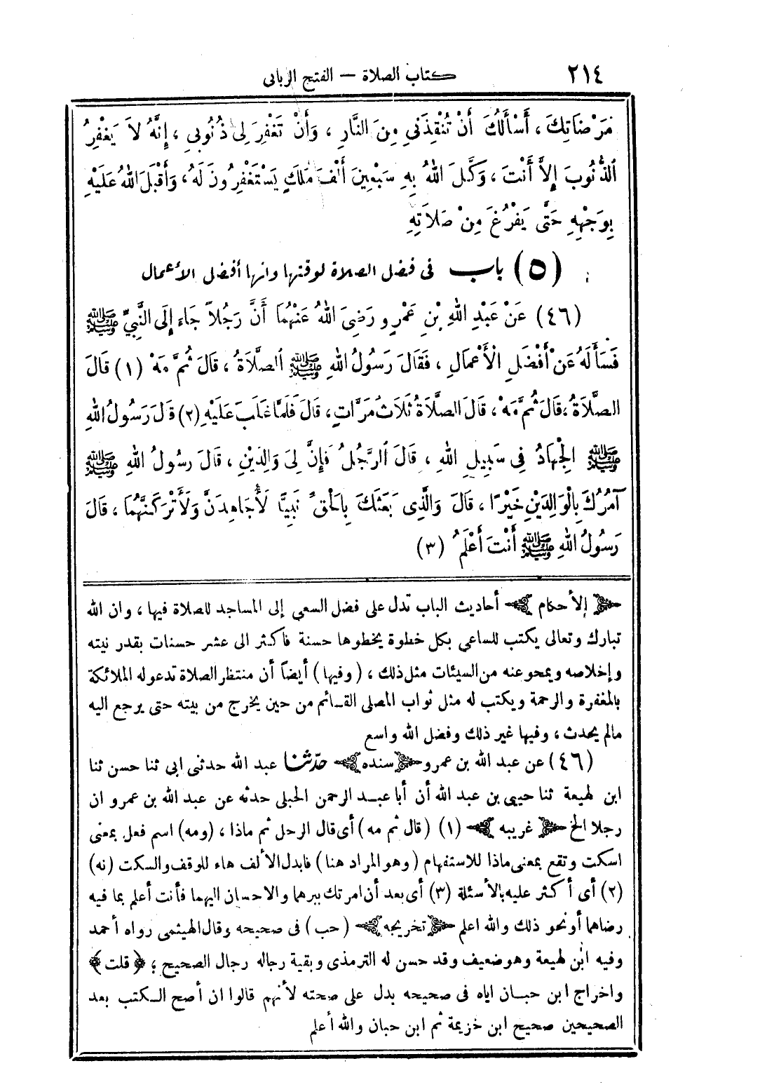 (46) عن عبد الله بن عمرو رضى الله عنهما أنَّ رجلًا جاء إلى النَّبيِّ صلى الله عليه وسلم فسأله عن أفضل الأعمال، فقال رسول الله صلى الله عليه وسلم الصَّلاة، قال ثمَّ مه قال الصَّلاة، قال ثمَّ مه، قال الصَّلاة ثلاث مرَّاتٍ، قال فلمَّا غلب عليه قال رسول الله صلى الله عليه وسلم الجهاد فى سبيل الله، قال الرَّجل فإنَّ لى والدين، قال رسول الله صلى الله عليه وسلم آمرك بالوالدين خيرًا، قال والذَّى بعثك بالحقِّ نبيًّا لأجاهدنَّ ولأتركنَّهما، قال رسول الله صلى الله عليه وسلم أنت أعلم
