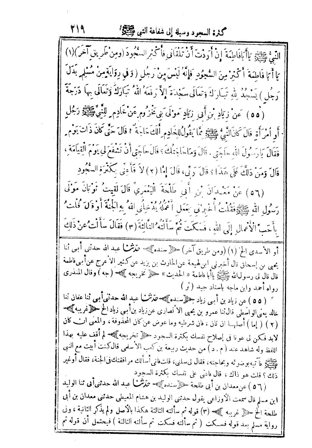 (55) عن زياد بن أبى زيادٍ مولى بنى مخزوم عن خادمٍ للنَّبىِّ صلى الله عليه وسلم رجل أو امرأةٍ قال كان النَّبيُّ صلى الله عليه وسلم ممَّا يقول للخادم ألك حاجةٌ؟ قال حتَّى كان ذات يوم فقال يا رسول الله حاجتى. قال وما حاجتك؟ قال حاجتى أن تشفع لى يوم القيامة، قال ومن دلَّك على هذا؟ قال ربِّى، قال إمَّا لا فأعنِّى بكثرة السُّجود