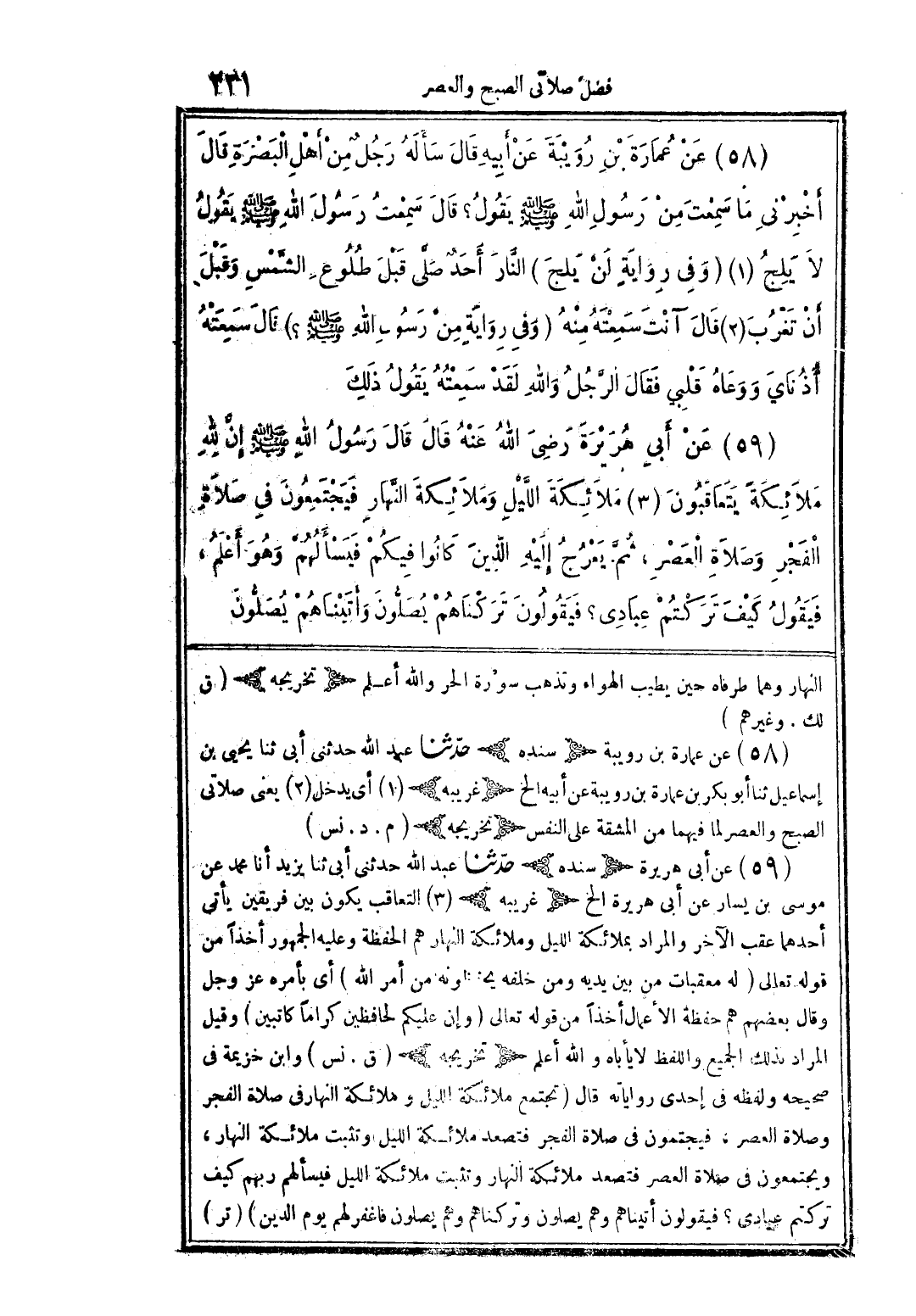 (58) عن عمارة بن رويبة عن أبيه قال سأله رجلٌ من أهل البصرة قال أخبرنى ما سمعت من رسول الله صلى الله عليه وسلم يقول؟ قال سمعت رسول الله صلى الله عليه وسلم يقول لا يلج (وفى روايةٍ لن يلج) النَّار أحدٌ صلَّى قبل طلوع الشَّمس وقبل أن تغرب قال آنت سمعته منه (وفى رواية من رسول الله صلى الله عليه وسلم؟) قال سمعته أذناي ووعاه قلبي فقال الرَّجل والله لقد سمعته يقول ذلك