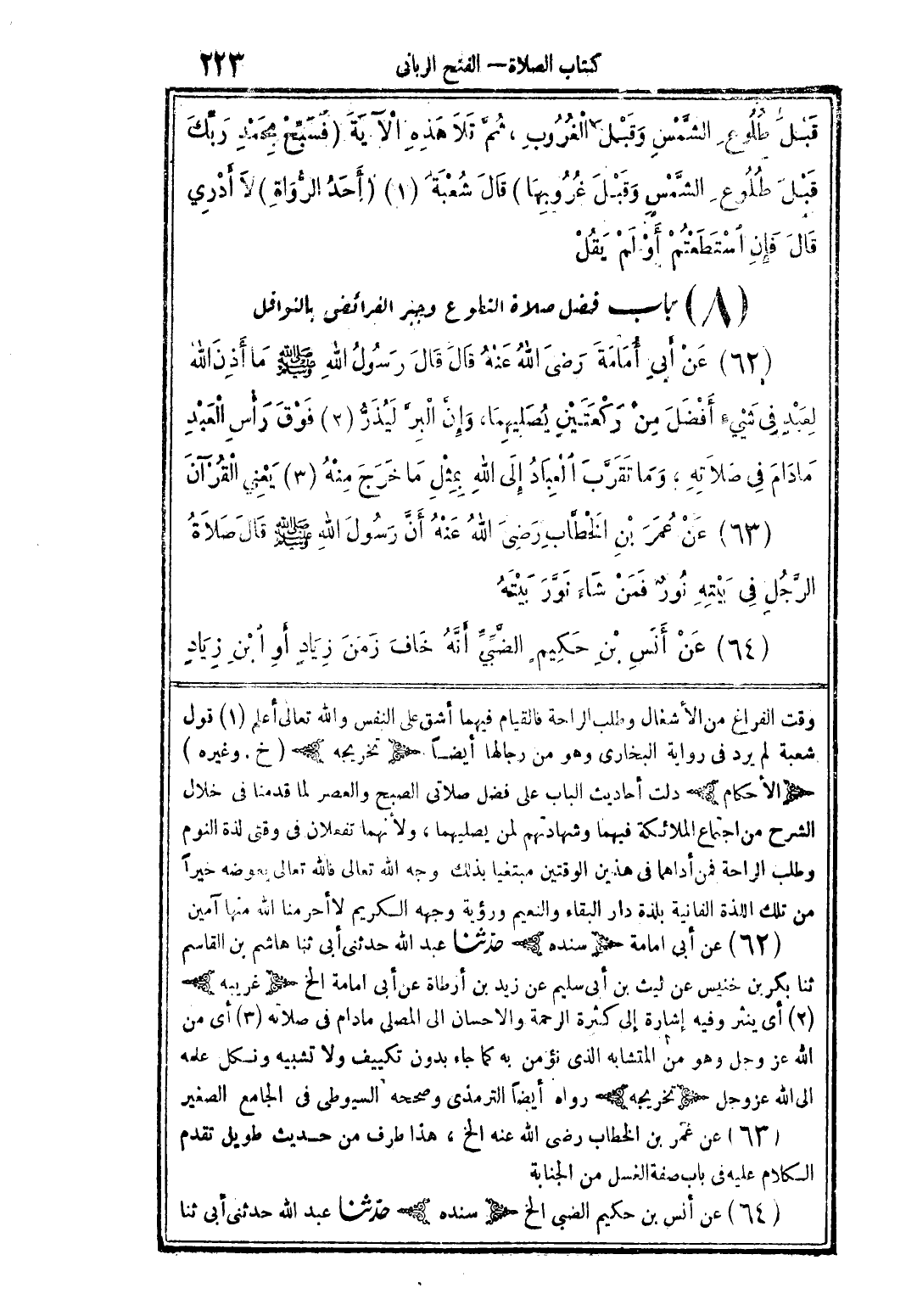 (62) عن أبى امامة (سنده) حدثنا عبد الله حدثنى أبى ثنا هاشم بن القاسم ثنا بكر بن خنيس عن ليث بن أبى سليم عن زيد بن أرطاة عن أبى امامة الخ (غريبه) (2) أى ينثر وفيه إشارة إلى كثرة الرحمة والاحسان الى المصلى مادام فى صلاته (3) أى من الله عز وجل وهو من المتشابه الذي نؤمن به كما جاء بدون تكييف ولا تشبيه ونكل علمه الى الله عز وجل (تخريجه) رواه أيضًا الترمذى وصححه السيوطى فى الجامع الصغير (63) عن عمر بن الخطاب رضى الله عنه الخ، هذا طرف من حديث طويل تقدم الكلام عليه فى باب صفة الغسل من الجنابة