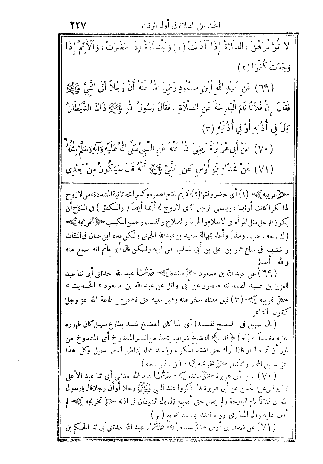 (69) عن عبد الله ابن مسعودٍ رضى الله عنه أنَّ رجلًا أتى النَّبيَّ صلى الله عليه وسلم فقال إنَّ فلانًا نام البارحة عن الصَّلاة، فقال رسول الله صلى الله عليه وسلم ذالك الشيَّطان بال فى أذنه أو في أذنيه