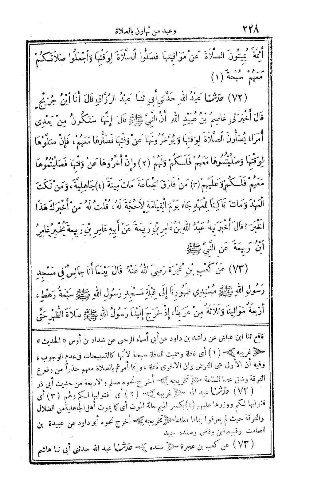 (72) حّدثنا عبد الله حدَّثنى أبى ثنا عبد الرَّزَّاق قال أنا ابن جريحٍ قال أخبرنى عاصم بن عبيد الله أنَّ النَّبيَّ صلى الله عليه وسلم قال إنَّها ستكون من بعدى أمراء يصلُّون الصَّلاة لوقتها ويؤخِّرونها عن وقتها فصلُّوها معهم، فإن صلَّوها لوقتها وصلَّيتموها معهم فلكم ولهم وإن أخَّروها عن وقتها فصلَّيتموها معهم فلكم وعليهم من فارق الجماعة مات ميتةً جاهليَّةً، ومن نكث العهد ومات ناكثًا للعهد جاء يوم القيامة لا حجَّة له، قلت له من أخبرك هذا الخبر؟ قال أخبرنيه عبد الله بن عامر بن ربيعة عن أبيه عامر بن ربيعة يخبر عامر ابن ربيعة عن النَّبيِّ صلى الله عليه وسلم
