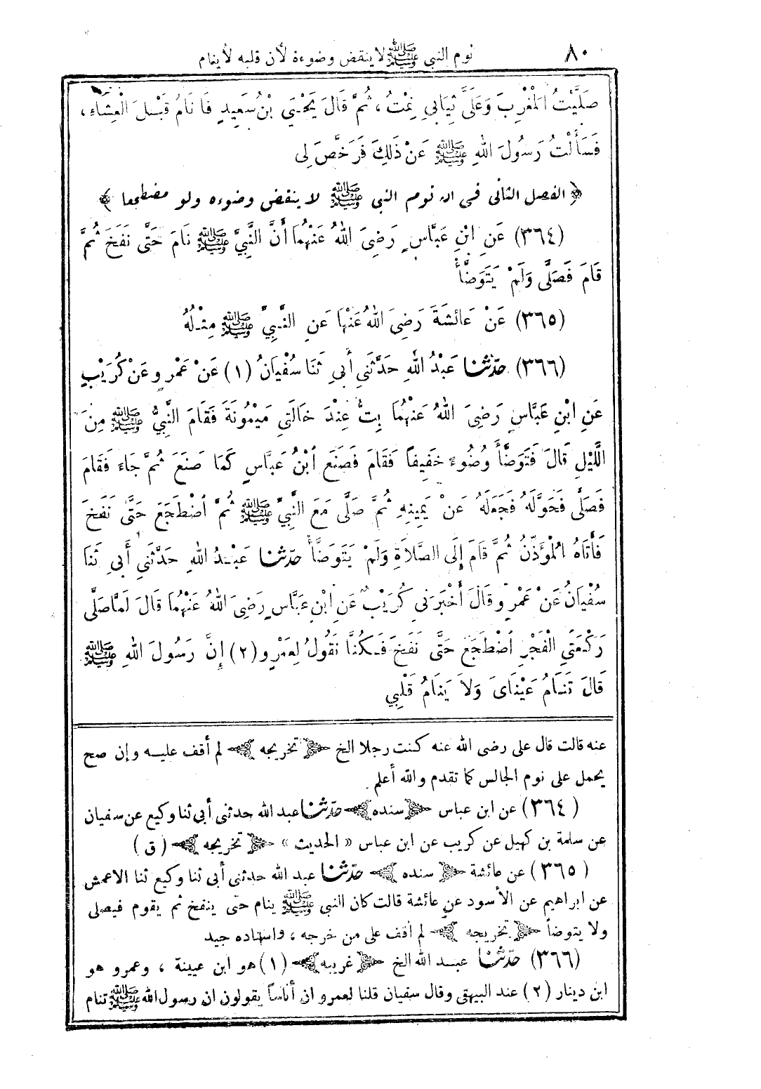 (366) حدّثنا عبد الله الخ (غريبه) (1) هو ابن عيينة، وعمرو هو ابن دينار (2) عند البيهقى وقال سفيان قلنا لعمرو ان أناساً يقولون ان رسول الله صلى الله عليه وسلم تنام