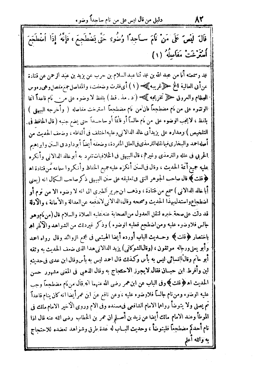 محمد وسمعته أنا من عبد الله بن محمد ثنا عبد السلام بن حرب عن يزيد بن عبد الرحمن عن قتادة عن أبي العالية الخ (غريبه) (1) أي فترت وضعفت، والمفاصل جمع مفصل وهي رءوس العظام والعروق (تخريجه) (د. مذ. قط) بلفظ لا وضوء على من نام قاعدًا انما الوضوء على من نام مضطجعًا فان من نام مضطجعًا استرخت مفاصله (وأخرجه البيهقي) بلفظ، لا يجب الوضوء على من نام جالسًا أو قائمًا أو ساجدًا حتى يضع جنبه (قال الحافظ في التلخيص) ومداره على يزيد أبي خالد الدالانى وعليه اختلف في ألفاظه، وضعف الحديث من أصله أحمد والبخاري فيما نقله