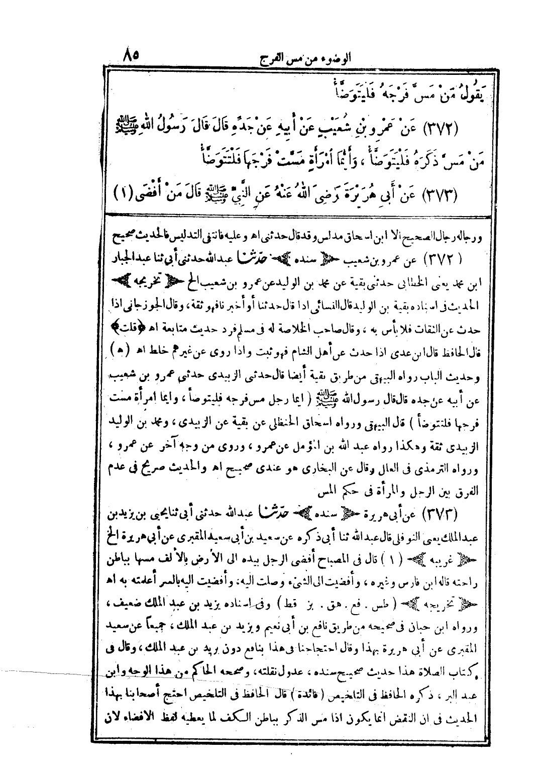 (372) عن عمرو بن شعيب عن أبيه عن جدِّه قال قال رسول الله صلى الله عليه وسلم من مسَّ ذكره فليتوضَّأ، وأيَّما امرأة مسَّت فرجها فلتتوضَّأ