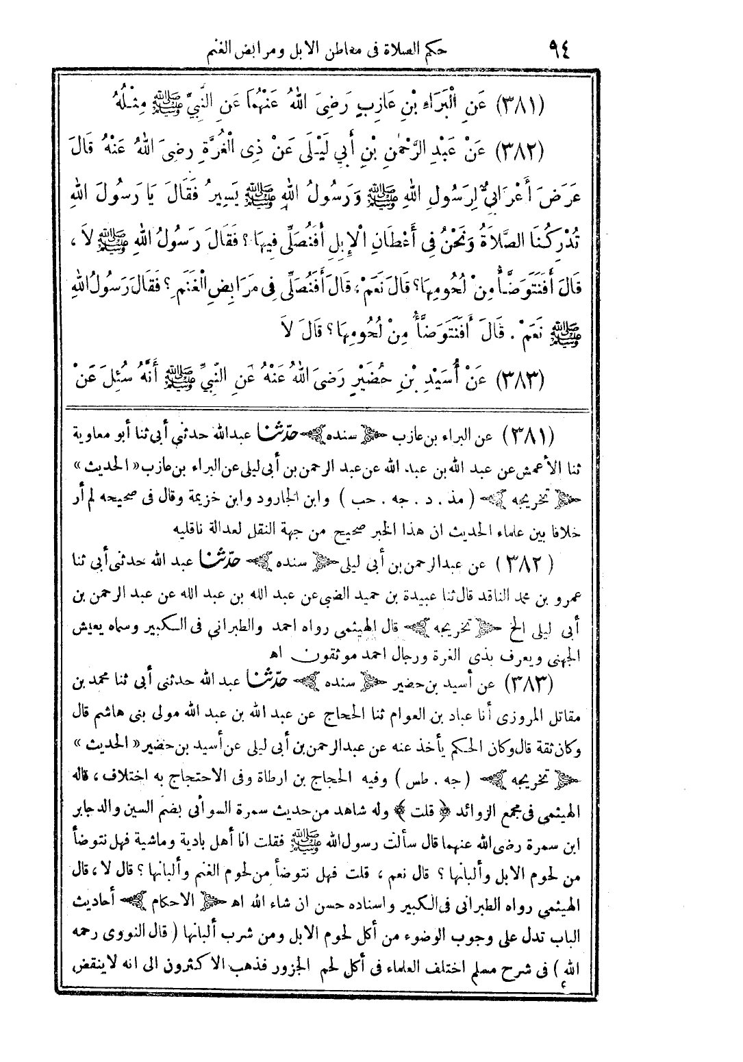 (382) عن عبد الرَّحمن بن أبى ليلى عن ذى الغرَّة رضى الله عنه قال عرض أعرابىُّ لرسول الله صلى الله عليه وسلم ورسول الله صلى الله عليه وسلم يسير فقال يا رسول الله تدركنا الصَّلاة ونحن فى أعطان الإبل أفنصلِّى فيها؟ فقال رسول الله صلى الله عليه وسلم لا، قال أفنتوضَّأ من لحومها؟ قال نعم، قال أفنصلِّى فى مرابض الغنم؟ فقال رسول الله صلى الله عليه وسلم نعم. قال أفنتوضَّأ من لحومها؟ قال لا