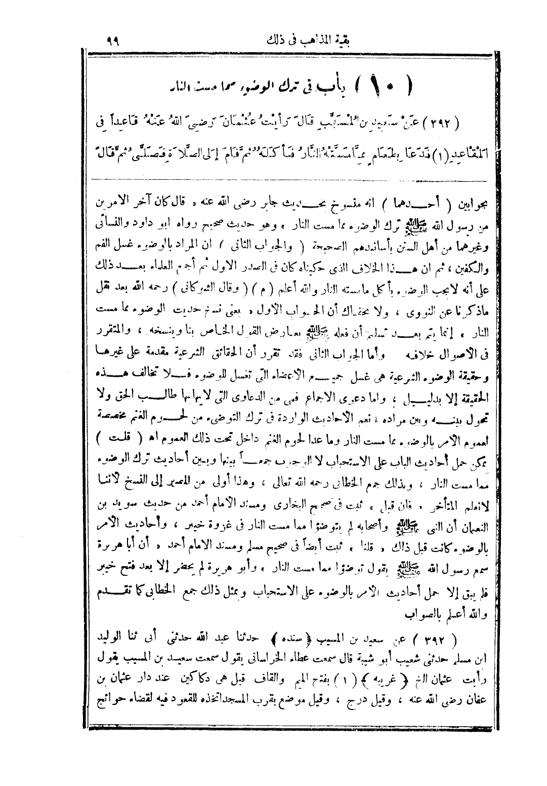 (392) عن سعيد بن المسيِّب قال رأيت عثمان رضى الله عنه قاعدًا فى المقاعد فدعا بطعام ممَّا مسَّته النَّار فأكله ثمَّ قام إلى الصَّلاة فصلِّى ثمَّ قال