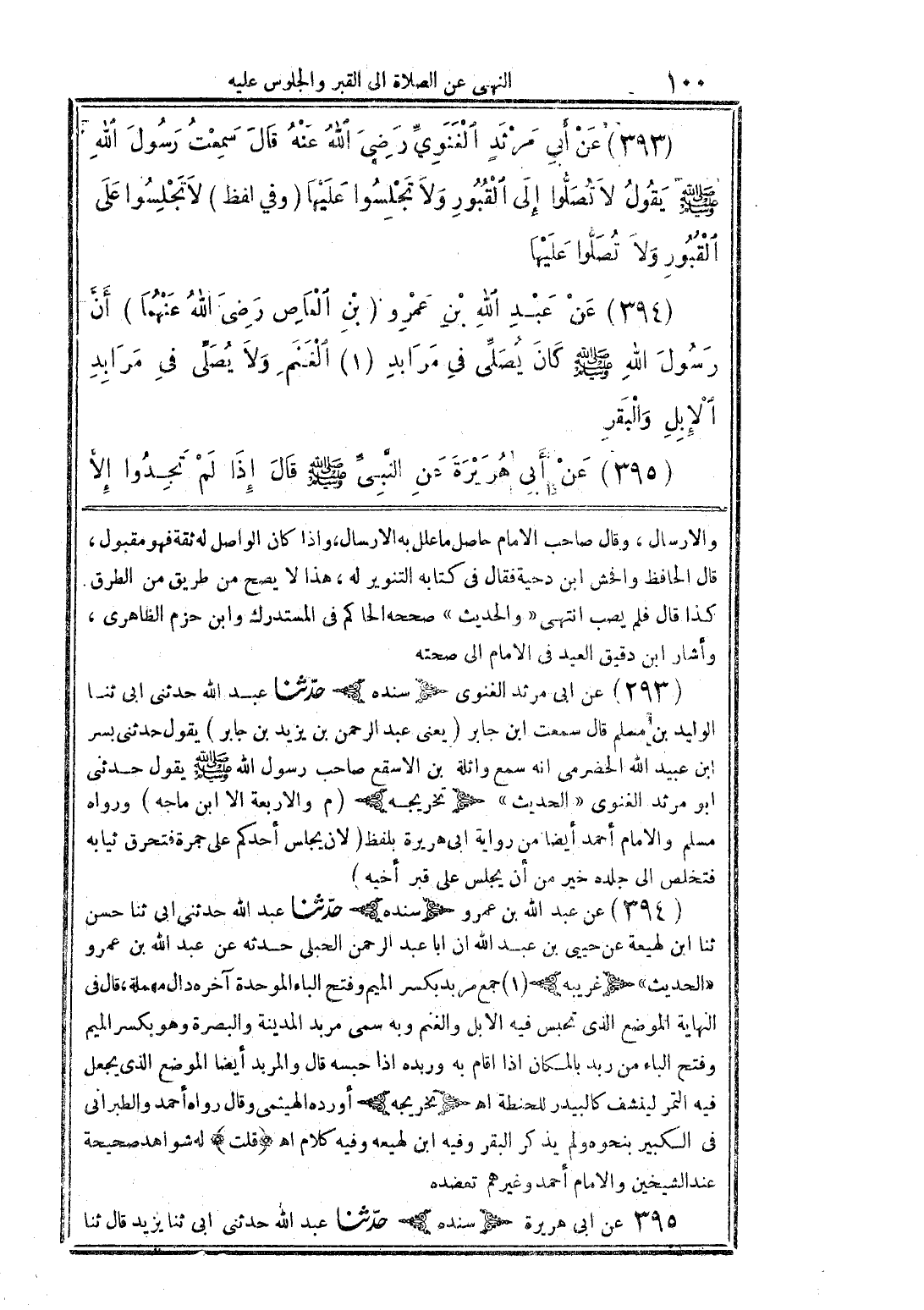 (393) عن أبي مرثدٍ الغنويِّ رضى الله عنه قال سمعت رسول الله صلى الله عليه وسلم يقول لا تصلُّوا إلى القبور ولا تجلسوا عليها (وفي لفظ) لا تجلسوا على القبور ولا تصلُّوا عليها