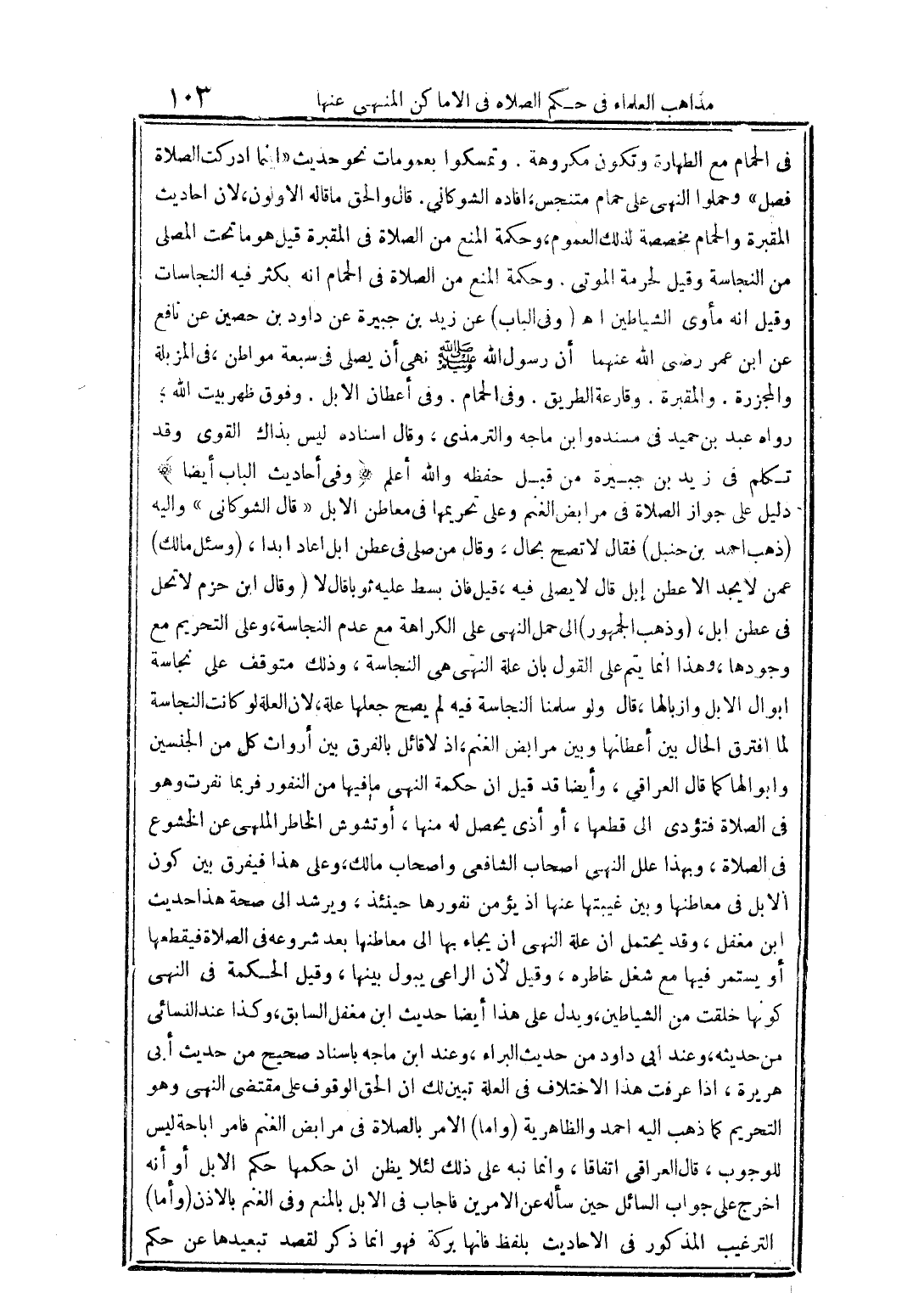 في الحمام مع الطهارة وتكون مكروهة وتمسكوا بعمومات نحو حديث " أينما أدركت الصلاة فصل " وحملوا النهي على حمام متنجس أفاده الشوكاني قال والحق ما قاله الأولون لأن أحاديث المقبرة والحمام مخصصة ذلك للعموم وحكمة المنع من الصلاة في المقبرة قيل هو ما تحت المصلى من النجاسة وقيل لحرمة الموتى وحكمة المنع من الصلاة في الحمام أنه بكثر فيه النجاسات وقيل أنه مأوى الشياطين اهـ (وفي الباب) عن زيد بن جبيرة عن داود بن حصين عن نافع عن ابن عمر رضي الله عنهما أن رسول الله صلى الله عليه وسلم نهى أن يصلي في سبعة مواطن في المزبلة والمجزرة والمقبرة وقارعة الطريق وفي الحمام وفي أعطان الإبل وفوق ظهر بيت الله رواه عبد بن حميد في مسنده وابن ماجه والترمذي وقال اسناده ليس بذاك القوي وقد تكلم في زيد بن جبيرة من قبل حفظه والله أعلم (وفي أحاديث الباب أيضاً) دليل على جواز الصلاة في مرابض الغنم وعلى تحريمها في معاطن الإبل " قال الشوكاني " وإليه (ذهب أحمد بن حنبل) فقال لا تصح بحال وقال من صلى في عطن إبل أعاد أبدا (وسئل مالك) عمن لا يجد إلا عطن إبل قال لا يصلي فيه قيل فإن بسط عليه ثوبا قال لا (وقال ابن حزم لا تحل في عطن إبل وذهب الجمهور) إلى حمل النهى على الكراهة مع عدم النجاسة وعلى التحريم مع وجودها وهذا إنما يتم على القول بأن علة النهي هي النجاسة وذك متوقف على نجاسة أبوال الإبل وإزبالها قال ولو سلمنا النجاسة فيه لم يصح جعلها علة لأن العلة لو كانت النجاسة لما افترق الحال بين أعطانها وبين مرابض الغنم إذ لا قائل بالفرق بين أرواث كل من الجنسين وأبوالها كما قال العراقي وأيضاً قد قيل أن حكمة النهى ما فيها من النفور فربما نفرت وهو في الصلاة فتؤدي إلى قطعها أو أذى يحصل له منها أو تشوش الخاطر الملهى عن الخشوع في الصلاة وبهذا علل النهي أصحاب الشافعي وأصحاب مالك وعلى هذا فيفرق بين كون الإبل في معاطنها وبين غيبتها عنها إذ يؤمن نفورها حينئذ ويرشد إلى صحة هذا حديث ابن مغفل وقد يحتمل أن علة النهي أن يجاء بها إلى معاطنها بعد شروعه في الصلاة فيقطعها أو يستمر فيها مع شغل خاطره وقيل لأن الراعي يبول بينها وقيل الحكمة في النهي كونها خلقت من الشياطين وبدل على هذا أيضاً حديث ابن مغفل السابق وكذا عند النسائي من حديثه وعند أبي داود من حديث البراء وعند ابن ماجه بإسناد صحيح من حديث أبي هريرة إذا عرفت هذا الاختلاف في العلة تبين لك أن الحق الوقوف على مقتضى النهي وهو التحريم كما ذهب إليه أحمد والظاهرية (وأما) الأمر بالصلاة في مرابض الغنم فأمر إباحة ليس للوجوب قال العراقي اتفاقا وإنما نبه على ذلك لئلا يظن أن حكمها حكم الإبل أو أنه أخرج على جواب السائل حين سأله عن الأمرين فأجاب في الإبل بالمنع وفي الغنم بالإذن (وأما) الترغيب المذكور في الأحاديث بلفظ فإنه بركة فهو إنما ذكر لقصد تبعيدها عن حكم