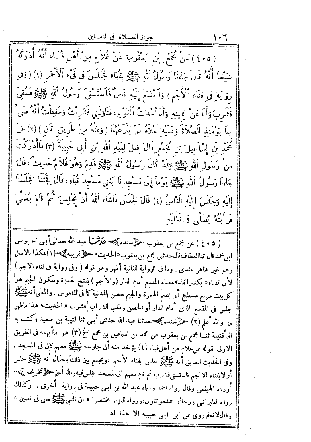 (405) عن مجمِّع بن يعقوب عن غلامٍ من أهل قباء أنَّه أدركه شيخًا أنَّه قال جاءنا رسول الله صلى الله عليه وسلم بقباء فجلس فى فئ الأحمر (1) (وفى روايةٍ فى فناء الأجم) واجتمع إليه ناسٌ فاستسقى رسول الله صلى الله عليه وسلم فسقى فشرب وأنا عن يمينه وأنا أحدث القوم، فناولني فشربت وحفظت أنَّه صلَّى بنا يومئذٍ الصَّلاة وعليه نعلاه لم ينزعهما (وعنه من طريقٍ ثانٍ) (2) عن محمَّد بن إسماعيل بن مجمِّع قال قيل لعبد الله بن أبى حبيبة (3) ما أدركت من رسول الله صلى الله عليه وسلم وقد كان رسول الله صلى الله عليه وسلم قدم وهو غلامٌ حديثٌ، قال جاءنا رسول الله صلى الله عليه وسلم يومًا إلى مسجدنا يعنى مسجد قباءٍ، قال فجئنا فجلسنا إليه وجلس إليه النَّاس (4) قال فجلس ما شاء الله أن يجلس ثمَّ قام يصلِّي فرأيته يصلِّى في نعليه