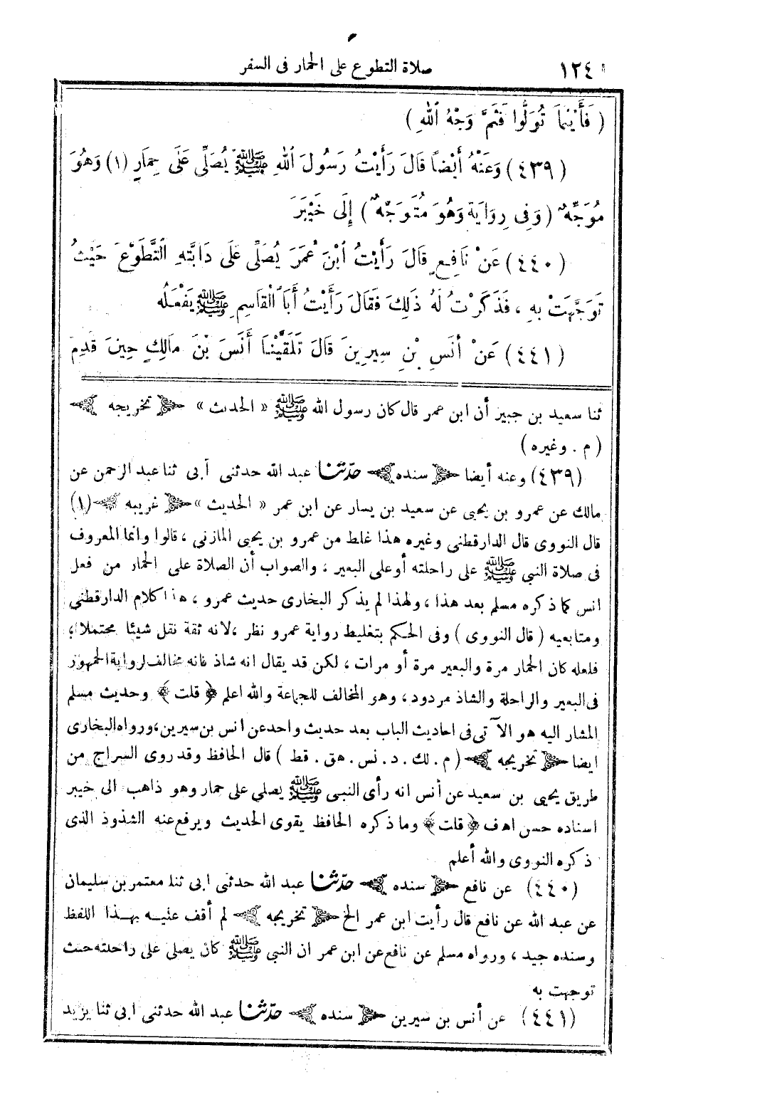 (440) عن نافعٍ قال رأيت ابن عمر يصلِّى على دابَّته التطَّوع حيث توجَّهت به، فذكرت له ذلك فقال رأيت أبا القاسم صلى الله عليه وسلم يفعله