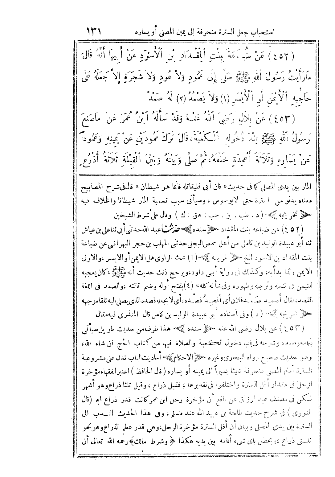 المار بين يدي المصلي كما في حديث " فأن أبي فليقاتله فإنما هو شيطان " قال في شرح المصابيح معناه يدنو من السترة حتى لا يوسوس وسيأتي سبب تسمية المار شيطاناً والخلاف فيه (تخريجه) (د. طب. بز. حب. هق. ك) وقال على شرط الشيخين 452 عن ضباعه بنت المقداد (سنده) حدثنا عبد الله حدثني أبي ثنا على بني عياش ثنا أبو عبيدة الوليد بن كامل من أهل حمص البجلي حدثني المهلب بن حجر البهراني عن ضباعه بنت المقداد بن الأسود الخ (غريبه) (1) شك الرواي هل الأيمن أو الأيسر والأولى الأيمن ولذا بدأبه وكذلك في رواية أبي داود ويرجح ذلك حديث أنه صلى الله عليه وسلم " كان بعجبه التيمن في تنعله وترجله وطهوره وفي شأنه كله " (4) فتح أوله وضم ثالثه والصمد في اللغة القصد يقال أصمد صمد فلان أي أقصد قصده أي لا يجعله قصده الذي يصلي إليه تلقاء وجهه (تخريجه) (د) وفي إسناده أبو عبيدة الوليد بن كامل قال المنذرى فيه مقال 453 عن بلال رضي الله عنه (سنده) هذا طرف من حديث طويل سيأتي بتمامه وسنده وشرحه في باب دخول الكعبة والصلاة فيها من كتاب الحج إن شاء الله وهو حديث صحيح رواه البخاري وغيره (الأحكام) أحاديث الباب تدل على مشروعية السترة أمام المصلى منحرفة شيئاً يسيراً إلى يمينه أو يساره (قال الحافظ) اعتبر الفقهاء مؤخرة الرحل في مقدار أقل السترة واختلفوا في تقديرها فقيل ذراع وقيل ثلثا ذراع وهو أشهر ليكن في مصنف عبد الرزاق عن نافع أن مؤخرة رحل ابن عمر كانت قدر ذراع اهـ (قال النووي) في شرح حديث طلحة بن عبيد الله عند مسلم وفي هذا الحديث الندب إلى السترة بين يدي المصلى وبيان أن أقل السترة مؤخرة الرحل وهي قدر عظم الذراع وهو نحو ثلثي ذراع ويحصل بأي شيء أقامه بين بيديه هكذا (وشرط مالك) رحمه الله تعالى أن