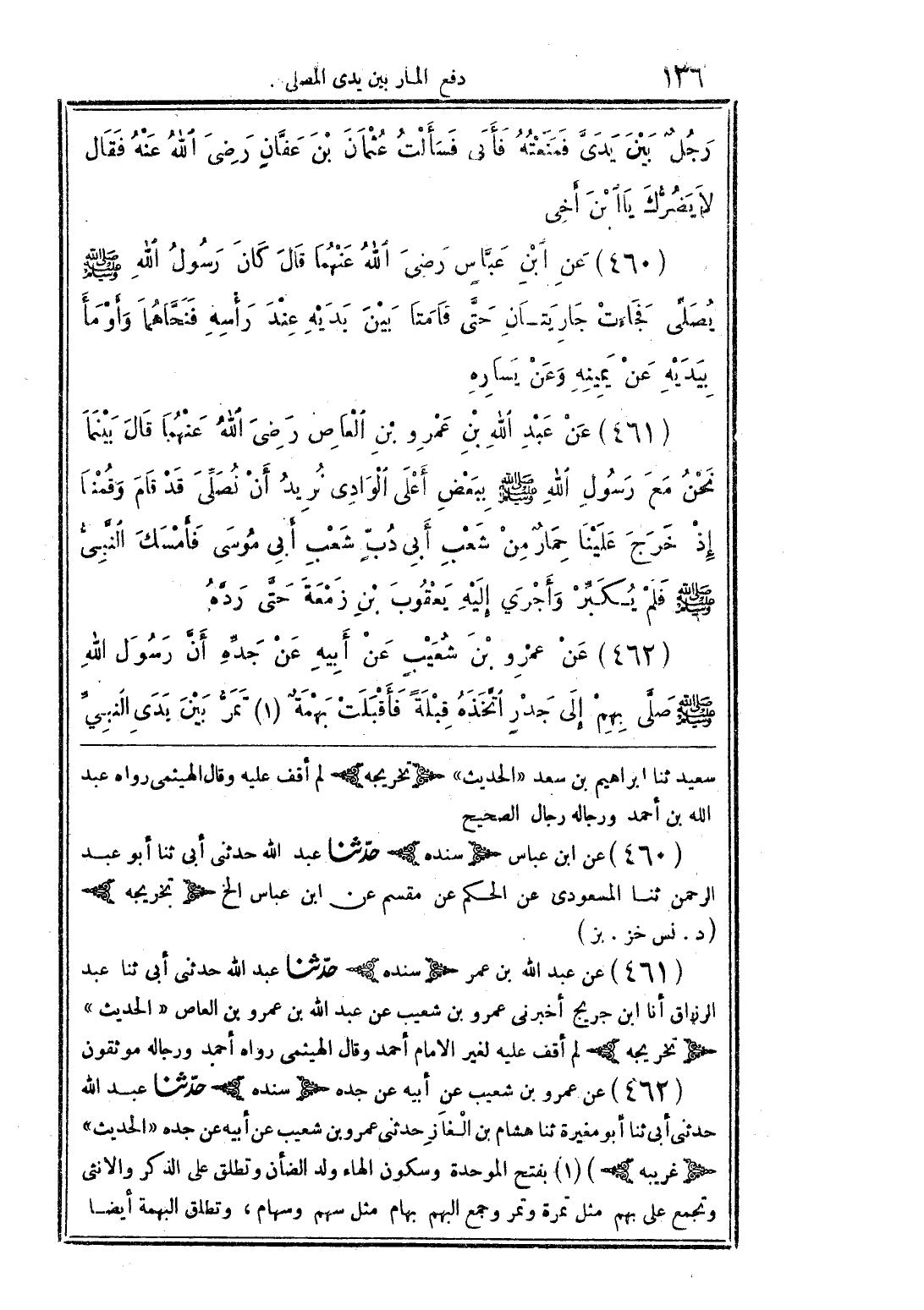 (461) عن عبد الله بن عمرو بن العاص رضى الله عنهُما قال بينما نحنُ مع رسُول الله صلى الله عليه وسلم ببعض أعلى الوادى نُريد أن نصلَّى قد قام وقُمنا إذ خرج علينا حمار من شعب أبى دُب مُوسى فأمسك النَّبى صلى الله عليه وسلم فلم يكبِّر وأجرى إليه يعقُوب بن زمعة حتِّى ردهُ