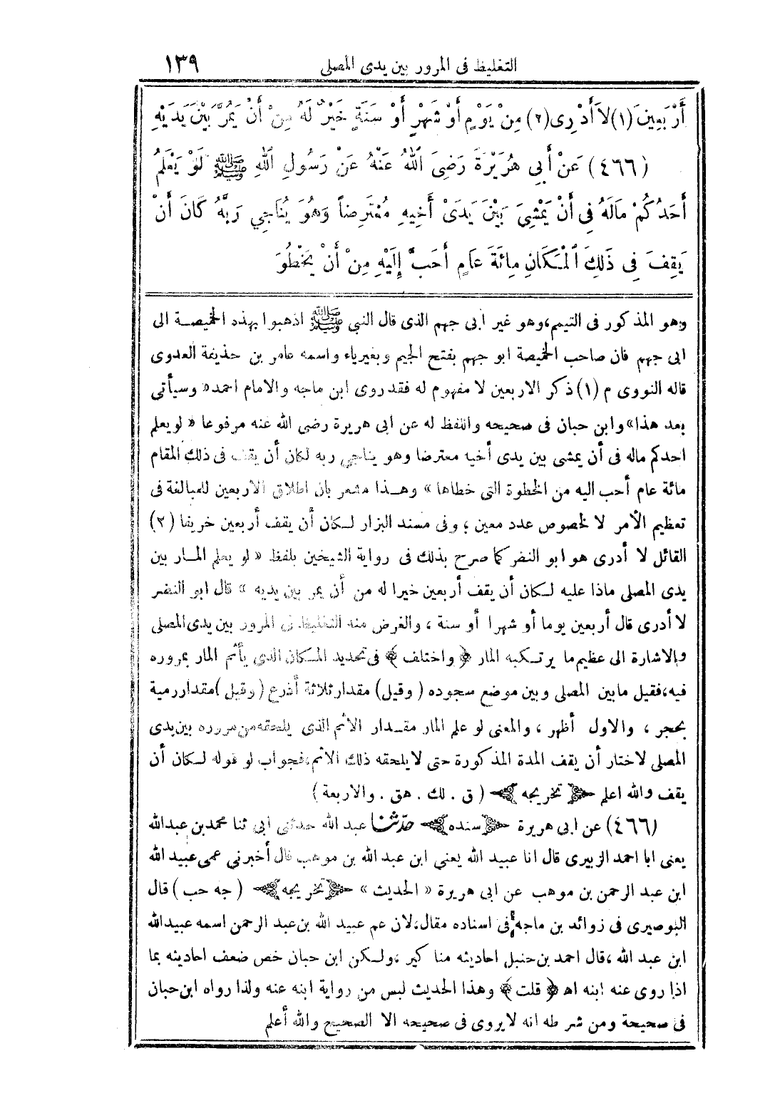 أربعين (1) لا أدري (2) من يومٍ أو شهر أو سنةٍ خير له من أن يُمرَّ بين يديه (466) عن أَبى هُريرة رضى الله عنهُ عن رسُول الله صلى الله عليه وسلم لو يعلمُ أحدُكُم مالهُ فى أن يمشى بين يدى أخيه مُعترضًا وهو يُناجى ربَّهُ كان أن يقف فى ذلك المكان مائة عامٍ أحبَّ إليه من أن يخطُو