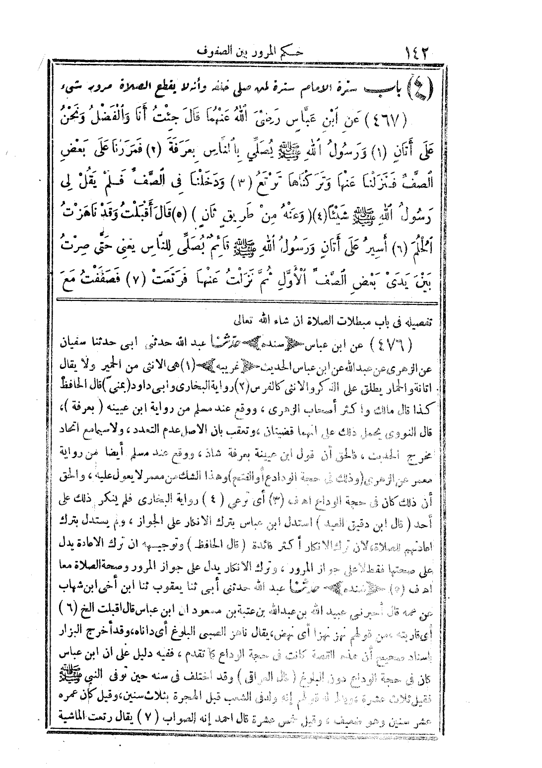 (4) باب سرة الامام سترة لمن صلى خلفه وأنه لا يقطع الصلاة مرور شئ (467) عن ابن عبَّاس رضى الله عنهُما قال جئتُ أنا والفضلُ ونحنُ على أتان (1) ورسُولُ الله عليه وسلم يصُلِّلى بالنَّاس بعرفة (2) فمررنا على بعض الصفَّ فنزلنا عنها وتر كناها ترتع (3) ودخلنا فى الصَّف فلم يقُل لى رسُول الله صلى الله عليه وسلم شيئًا (4) (وعنهُ من طريق ثانٍ) (5) قال أقبلت وقد ناهزتُ الُحُلم (6) أسيرُ على أتان ورسُولُ صلى الله عليه وسلم قائم يُصلِّى للناس يعنى حتى صرت بين يدى بعض الّصف الأوَّل ثُم نزلت عنها فرتعت (7) فصففُ مع