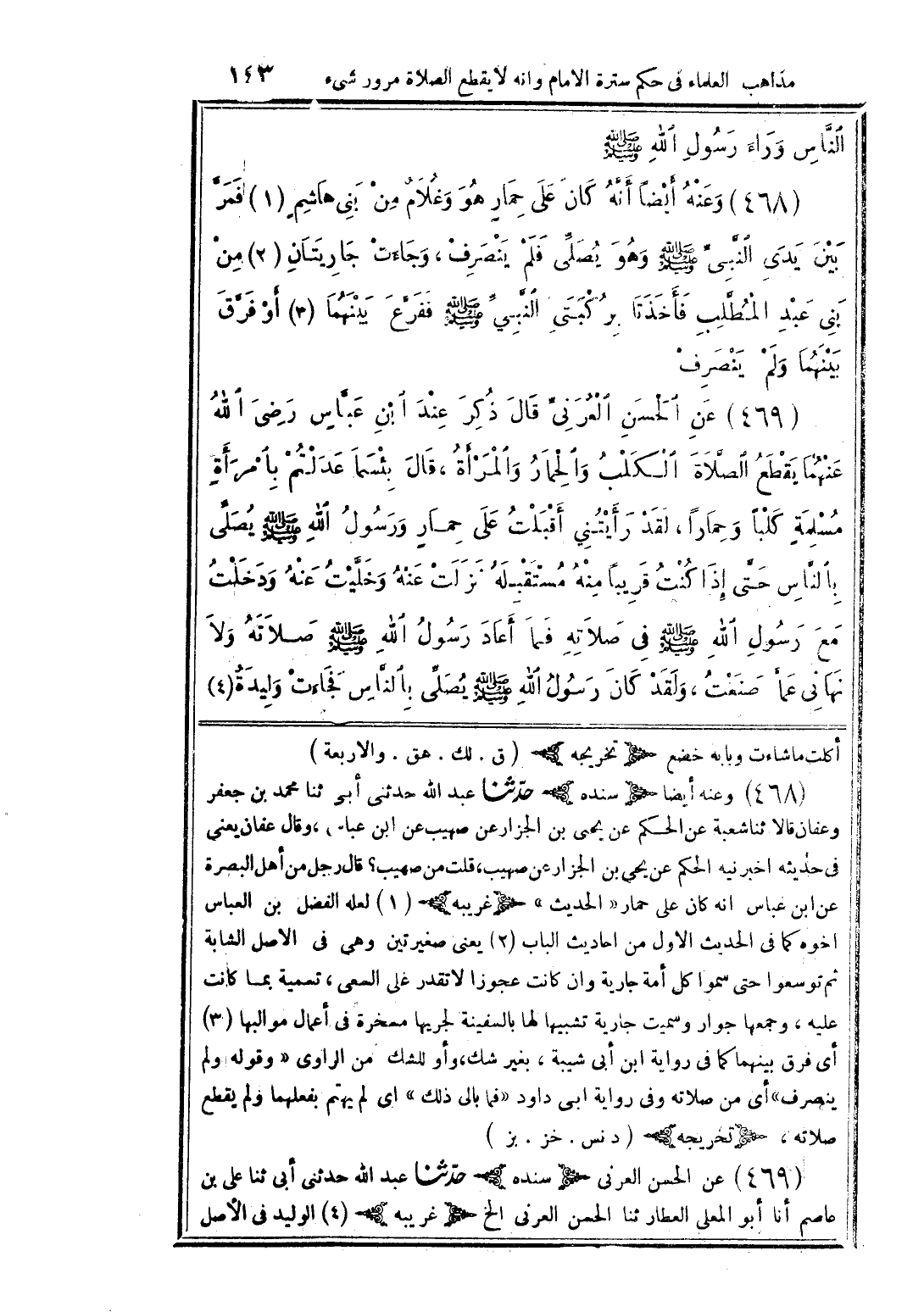 (469) عن الحسن المُرنىِّ قال ذكر عند ابن عبَّاس رضى الله عنهُما يقطع الصلَّاة الكلب والحمارُ والمرأة، قال بئسما عدلتم بامرأة مسلمة كلبًا وحمارًا، لقد رأيتنى أقبلت على حماًر ورسُولُ الله صلى الله عليه وسلم يصلِّى بالنَّاس حتَّى إذا كُنتُ قريبًا منهُ مُستقبلهُ نزلت عنهُ وخلَّيتُ عنهُ ودخلت مع رسُولُ الله صلى الله عليه وسلم يُصلِّى بالنَّاس فجاءت وليدة (4)
