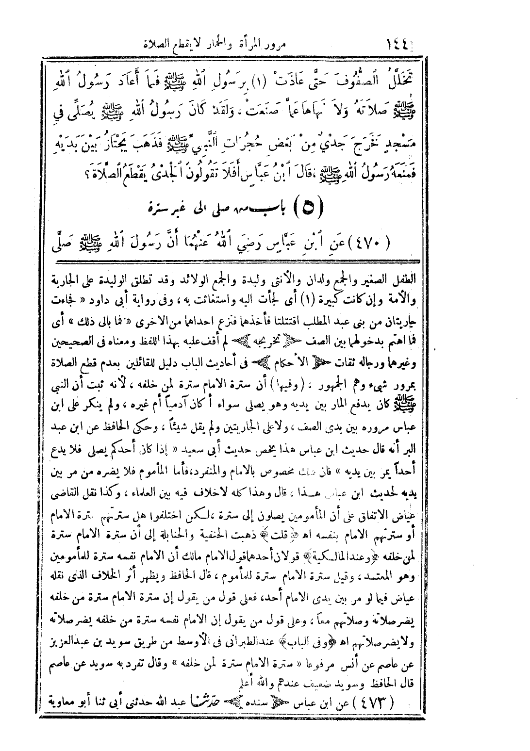 تخلل الصفُوف حتَّى عادت (1) برسُول الله صلى الله عليه وسلم فما أعاد رسثولُ الله صلى الله عليه وسلم صلاتهُ ولا نهاها عماَّ صنعت، ولقد كان رسُولُ الله صلى الله عليه وسلم يُصلِّى فى مسجدٍ فخرج جدي من بعض حُجرات النَّبي صلى الله عليه وسلم فذهب يجتازُ بين يديه فمنعه رسُولُ الله صلى الله عليه وسلم، قال ابنُ عبَّاس أفلا تقُولُون الجدى يقطع الصلاة؟