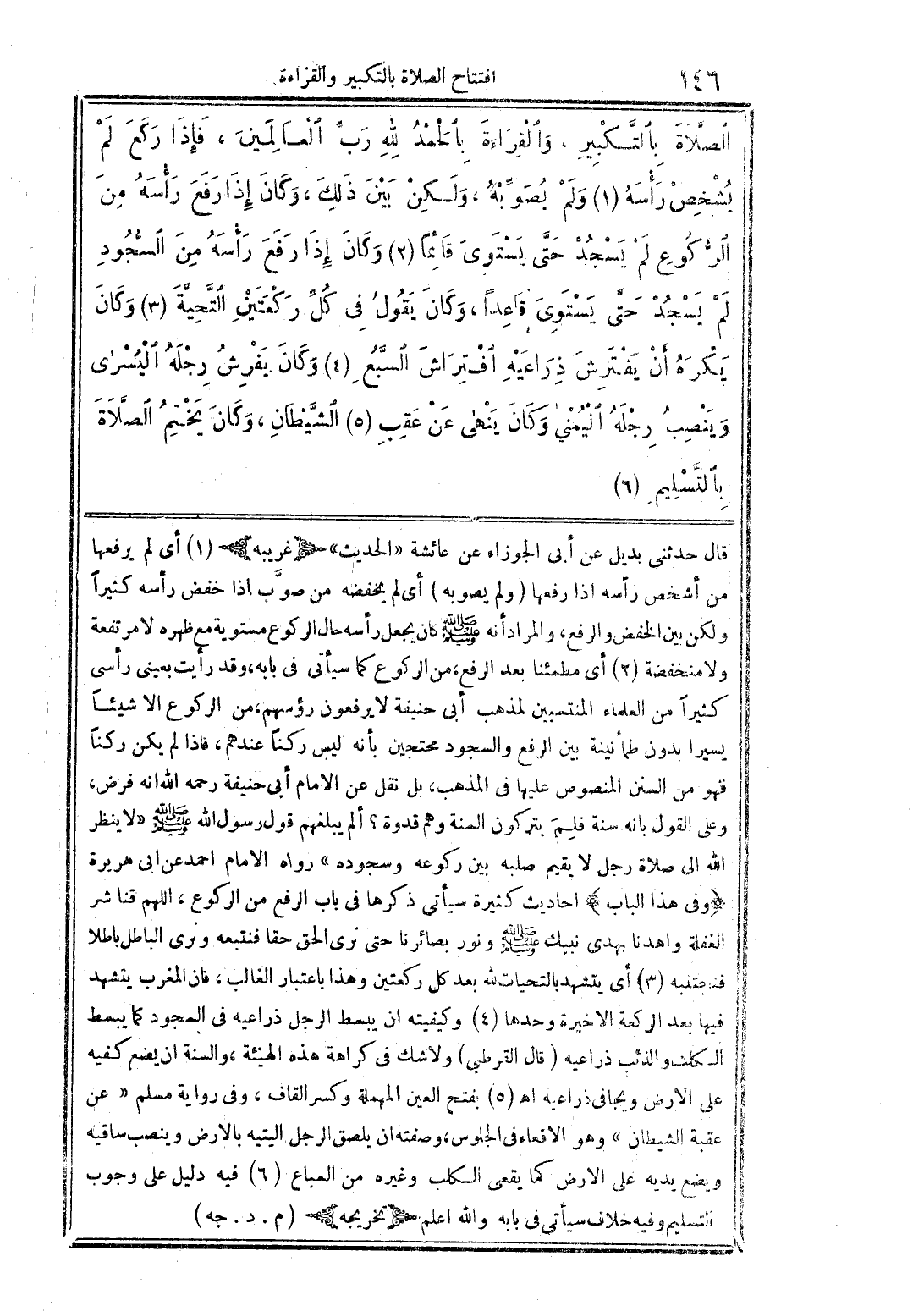 الصلَّاة بالتَّكبير، والقراءة بالحمد لله رب العالمين، فإذا ركع لم ايثشخص رأسه (1) ولم يصوَّبهُ، ولكن بين ذلك، وكان إذا رفع رأسهُ من الرَّكوع لم يسجد حتَّى بستوى قائما (2) وكان إذا رفع رأسهُ من السجُود لم يسجدثد حتَّى يستوى قاعدًا، وكان يقول فى كُل ركعتين التحيَّة (3) وكان يكره أن يفترش ذراعيه افترش السبعُ (4) وكان بفرش رجلهُ اليُسرى وينصب رجلهُ اليمنى وكان ينهى عن عقب (5) الشَّيطان، وكان يختمُ الصلاة بالتّسليم (6)