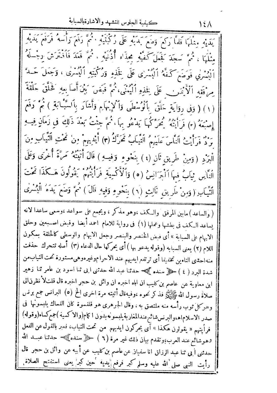 يديه مثلها فلمَّا ركع وضع يديه على ركبتيه، ثُم رفع رأسه فرفع يديه مثلها، ثُم سجد فجعل كيفَّه محذاء أذنيه، ثُمَّ قعد فافترش رجله اليُسرى فوضع كفّهُ اليُسرى على فخده ورُكبته اليُسرى، وجعل حد مرفقه الايمن على فخذه اليُمنى، ثُمَّ قبض بين أصابه فخلَّّق حلقه (1) (وفى رواية حلَّق بالوسطى والابهام وأشار بالسبابة) ثُمَّ رفع إِصبعهُ (3) فرأيته يّحرِّكُها يدعو بها، ثُمَّ جئت بعد ذلك فى زمان فيه برد فرأيتُ النَّاس عليهم الثياب تحرك (3) أيديهم من تحت الثياب من البرد (ومن طريق ثان (4) بنحوه وفيه) قال أتيتهُ مرةَّ أخرى وعلى النَّاس ثياب فيها البرانسُ (5) والأكسية فرأيتهم يقولون هكذا تحت الثياب (ومن طريق ثالث (6) بنحوه وفيه قال) ثم وضع يده اليُسرى