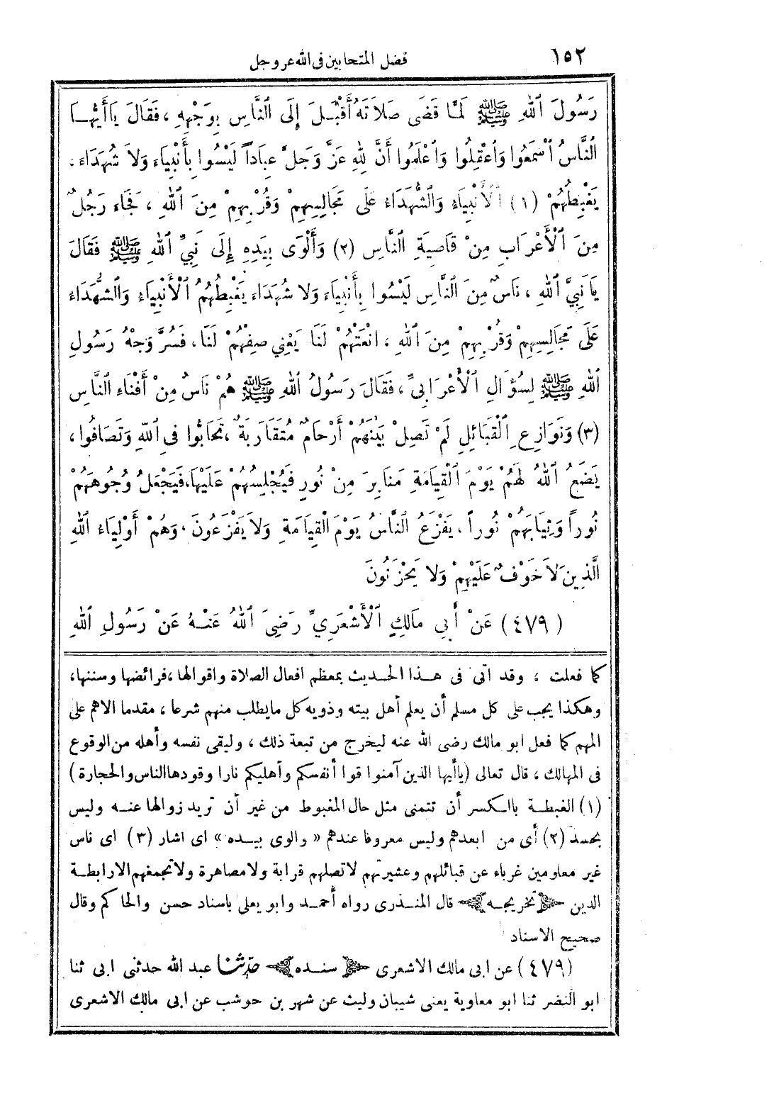 رسول الله صلى الله عليه وسلم لمَّا قضى صلاته أقبل إلى النَّاس بوجهه, فقال يا أيُّها النَّاس اسمعوا واعقلوا واعلموا أنَّ لله عزَّ وجلَّ عبادًا ليسوا بأنبياء ولا شهداء, يغبطهم (1) الأنبياء والشهداء على مجالسهم وقربهم من الله, فجاء رجل من الأعراب من قاصية الناس (2) وألوى بيده إلى نبي الله صلى الله عليه وسلم فقال يا نبيَّ الله, ناس من النَّاس ليسوا بأنبياء ولا شهداء يغبطهم الأنبياء والشهداء على مجالسهم وقربهم من الله, انعتهم لنا يعني صفهم لنا, فسرَّ وجه رسول الله صلى الله عليه وسلم لسؤال الأعرابىِّ, فقال رسول الله صلى الله عليه وسلم هم ناس من أفناء النَّاس (3) ونوازع القبائل لم تصل بينهم أرحام متقاربة, تحابُّوا فى الله وتصافوا, يضع الله لهم يوم القيامة منابر من نور فيجلسهم عليها, فيجعل وجوههم نورًا وثيابهم نورًا, يفزع النًّاس يوم القيامة ولا يفزعون, وهم أولياء الله الَّذين لا خوف عليهم ولا يحزنون