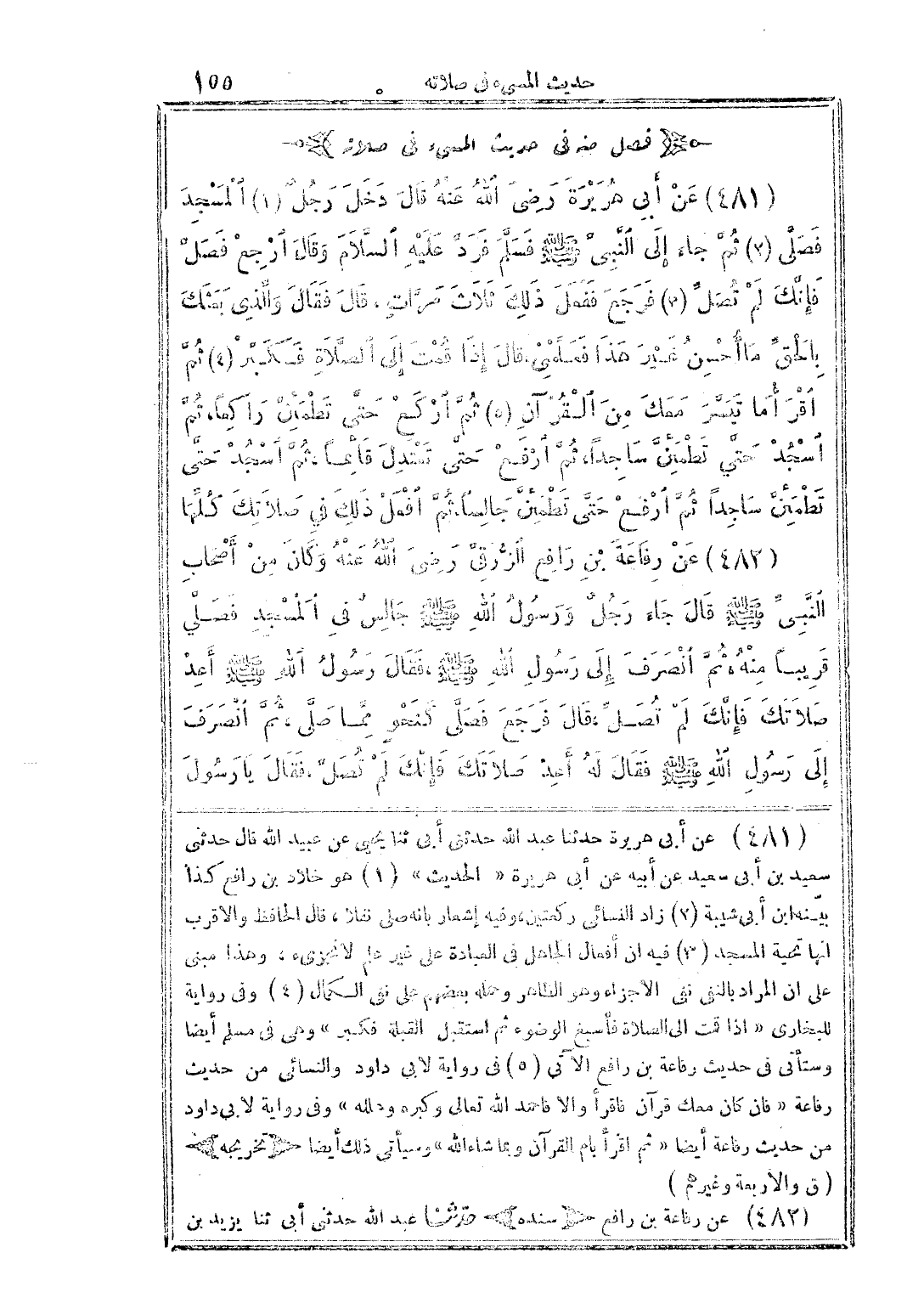 (481) عن أبى هريرة رضى الله عنه قال دخل رجل (1) المسجد فصلى (2) ثم جاء إلى النبى صلى الله عليه وسلم فسلَّم فردِّ عليه السَّلام وقال ارجع فصل فإنَّك لم تصلَّ (3) فرجع ففعل ذلك ثلاث مرَّات, قال فقال والَّذى بعثك بالحق ما أحسن غير هذا فعلَّمى. قال إذا قمت إلى الصَّلاة فكبر (4) ثمَّ اقرأ ما تيسَّر معك من القرآن (5) ثمَّ اركع حتَّى تطمن راكعًا, ثمَّ اسجد حتَّي تطمئنَّ ساجدّا, ثم أرفع حتى تستدل قائمًا, ثمَّ أسجد حتىَّ تطمئنَّ ساجدًا ثمَّ ارفع حتَّى تطمئنَّ جالسًا, ثمَّ افعل ذلك في صلاتك كلهِّا (482) عن رفاعة بن رافع الزُّرقىَّ رضى الله عنه وكان من أصحاب النَّبىِّ صلى الله عليه وسلم قال جاء رجل ورسول الله صلى الله عليه وسلم جالس فى المسجد فصلَّي قريبًا منه, ثمَّ انصرف إلى رسول الله صلى الله عليه وسلم, فقال رسول الله صلى الله عليه وسلم أعد صلاتك فإنَّك لمّ تصلِّ, قال فرجع فصلَّى كنحو مَّما صلَّى, ثمَّ انصرف إلى رسول الله صلى الله عليه وسلم فقال له أعد صلاتك فإنك لم تصلَّ, فقال يا رسول