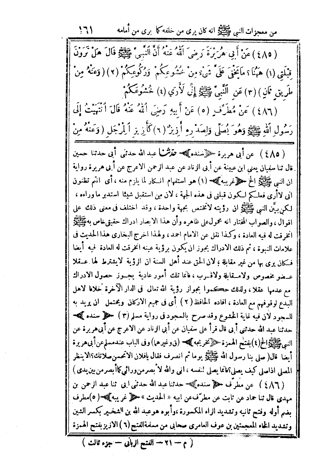 (485) عن أبي هريرة رضى الله عنه أنَّ النبى صلى الله عليه وسلم قال هل ترون قبلتى (1) ههنا؟ ما يخفى على شئ من خشوعكم وركوعكم (2) (وعنه من طريق ثان) (3) عن النبى صلى الله عليه وسلم إنِّى لأري (4) خشوعكم (486) عن مطرف (5) عن أبيه رضى الله عنه قال انتهيت إلى رسول الله صلى الله عليه وسلم وهو يصلى ولصدره أزير (6) كأزير المرجل (وعنه من