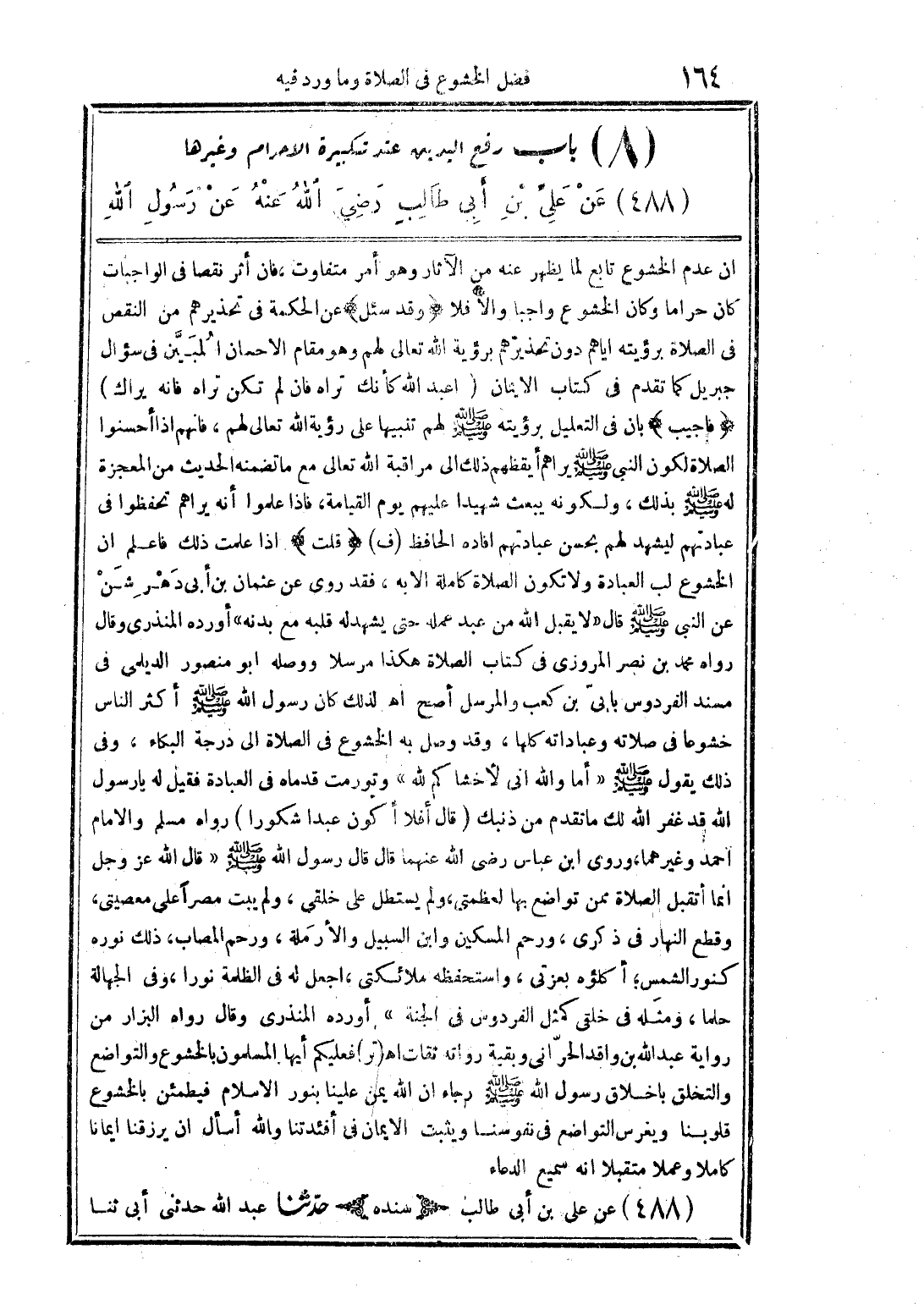 أن عدم الخشوع تابع لما يظهر عنه من الآثار وهو أمر متفاوت فإن أثر نقصاً في الواجبات كان حراماً وكان الخشوع واجباً وإلا فلا (وقد سئل) عن الحكمة في تحذيرهم من النقص في الصلاة برؤيته إياهم دون تحذيرهم برؤية الله تعالى لهم وهو مقام الإحسان المبين في سؤال جبريل كما تقدم في كتاب الإيمان (اعبد الله كأنك تراه فإن لم تكن تراه فإنه يراك) (فأجيب) بأن في التعليل برؤيته صلى الله عليه وسلم لهم تنبيهاً على رؤية الله تعالى لهم فإنهم إذا أحسنوا الصلاة لكون النبي صلى الله عليه وسلم يراهم أيقظهم ذلك إلى مراقبة الله تعالى مع ما تضمنه الحديث من المعجزة له صلى الله عليه وسلم بذلك ولكونه يبعث شهيداً عليهم يوم القيامة فإذا علموا أنه يراهم تحفظوا في عبادتهم ليسهد لهم بحسن عبادتهم أفاده الحافظ (ف) (قلت) إذا علمت ذلك فإعلم أن الخشوع لب العبادة ولا تكون الصلاة كاملة إلا به فقد روى عن عثمان بن أبي دهر شن عن النبي صلى الله عليه وسلم قال " لا يقبل الله من عبد عمله حتى يشهد له قلبه مع بدنه " أورده المنذرى وقال رواه محمد بن نصر المروزي في كتاب الصلاة هكذا مرسلاً وصله أبو منصور الديملي في مسند الفردوس يأبي بن كعب والمرسل أصح اهـ لذلك كان رسول الله صلى الله عليه وسلم أكثر الناس خشوعاً في صلاته وعباداته كلها وقد وصل به الخشوع في الصلاة إلى درجة البكاء وفي ذلك يقول صلى الله عليه وسلم " أما والله إني لأخشاكم لله " وتورمت قدماه في العبادة فقيل له يا رسول الله قد غفر الله لك ما تقدم من ذنبك (قال أفلا أكون عبد شكوراً) رواه مسلم والإمام أحمد وغيرهما وروى ابن عباس رضي الله عنهما قال قال رسول الله صلى الله عليه وسلم " قال عز وجل إنما أتقبل الصلاة ممن تواضع بها لعظمتي ولم يستطل على خلقي ولم يبت مصراً على معصيتي وقطع النهار في ذكري ورحم المسكين وابن السبيل والأرملة ورحم المصاب ذلك نوره كنور الشمس أكلؤه بعزتي واستحفظه ملائكتي اجعل له في الظلمة نوراً وفي الجهالة حلماً ومثله في خلقي كمثل الفردوس في الجنة " أورده المنذرى وقال رواه البزار من رواية عبد الله بن واقد الحراني وبقية رواته ثقات اهـ (تر) فعليكم أيها المسلمون بالخشوع والتواضع والتخلق بأخلاق رسول الله صلى الله عليه وسلم رجاء أن الله يمن علينا بنور الإسلام فيطمئن بالخشوع قلوبنا ويغرس التواضع في نفوسنا ويثبت الإيمان في أفئدتنا والله أسأل أن يرزقنا إيماناً كاملاً وعملاً متقبلاً إنه سميع الدعاء 488 عن على بن أبي طالب (سنده) حدثنا عبد الله حدثني أبي ثنا