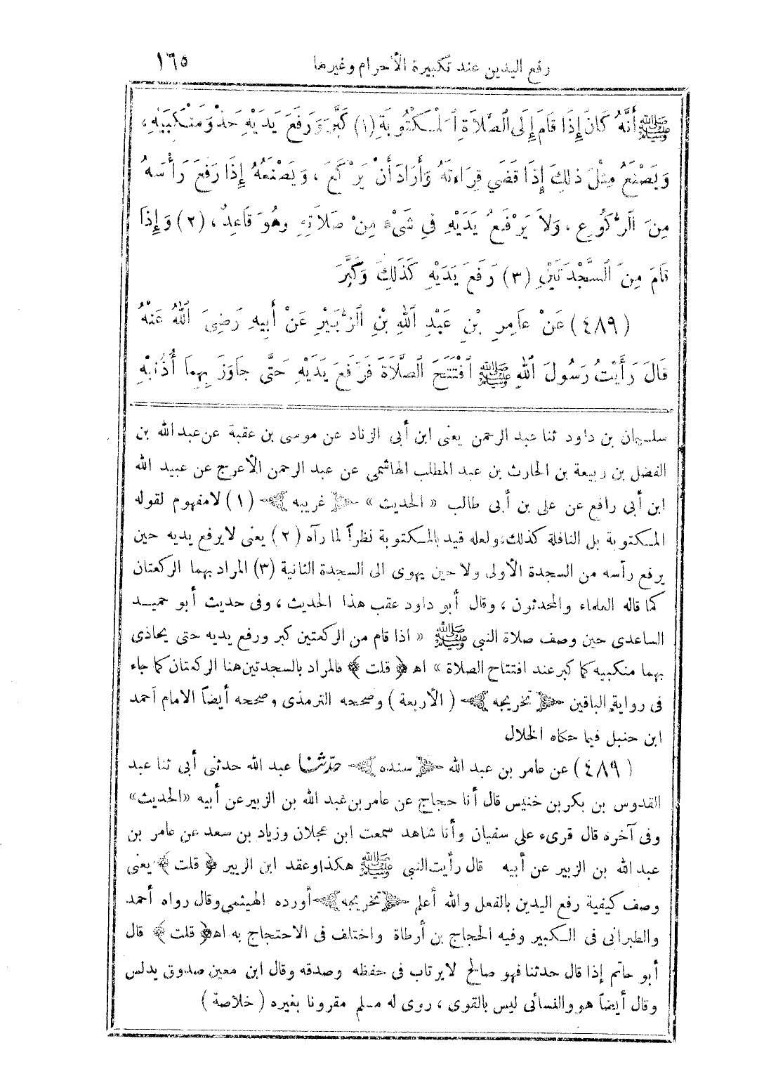 سليمان بن داود ثنا عبد الرحمن يعني ابن الزناد عن موسى بن عقبة عن عبد الله بن الفضل بن ربيعة بن الحارث بن عبد المطلب الهاشمي عن عبد الرحمن الأعرج عن عبيد الله ابن أبي رافع عن علي بن أبي طالب "الحديث " (غريبه) (1) لا مفهوم لقوله المكتوبة بل النافلة كذلك ولعله قيد بالمكتوبة نظراً لما رآه (2) يعني لا يرفع يديه حين يرفع رأسه من السجدة الأولى ولا حين يهوى إلى السجدة الثانية (3) المراد بهما الركعتان كما قاله العلماء والمحدثون وقال أبو داود عقب هذا الحديث وفي حديث أبو حميد الساعدي حين وصف صلاة النبي صلى الله عليه وسلم " إذا قام من الركعتين كبر ورفع يديه حتى يحاذي بهما منكبيه كما كبر عند افتتاح الصلاة " اهـ (قلت) فالمراد بالسجدتين هنا الركعتان كما جاء في رواية الباقين (تخريجه) (الأربعة) وصححه الترمذي وصححه أيضاً الإمام أحمد ابن حنبل فيما حكاه الخلال 489 عن عامر بن عبد الله (سنده) حدثنا عبد الله حدثني أبي ثنا عبد القدوس بن بكر بن خنيس قال أنا حجاج عن عامر بن عبد الله بن الزبير عن أبيه " الحديث " وفي آخره قال قرئ على سفيان وأنا شاهد سمعت ابن عجلان وزياد بن سعد عن عامر بن عبد الله بن الزبير عن أبيه قال رأيت النبي صلى الله عليه وسلم هكذا وعقد ابن الزبير (قلت) يعني وصف كيفية رفع اليدين بالفعل والله أعلم (تخريجه) أورده الهيثمي وقال رواه أحمد والطبراني في الكبير وفيه الحجاج بن أرطاة واختلف في الاحتجاج به اهـ (قلت) قال أبو حاتم إذا قال حدثنا فهو صالح لا يرتاب في حفظه وصدقه وقال ابن معين صدوق يدلس وقال أيضاً هو والنسائي ليس بالقوي روى له مسلم مقروناً بغيره (خلاصة)