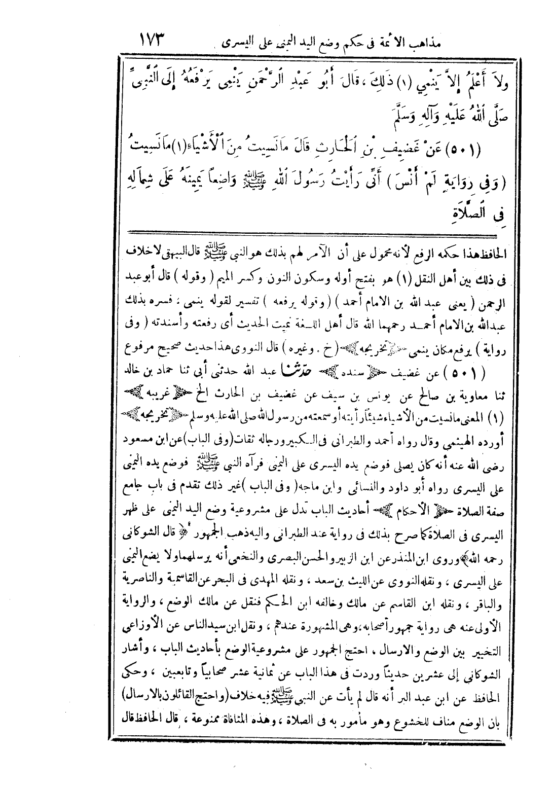 (501) عن غضيف بن الحارث قال ما نسيتُ من الأشياء (1) ما نسيتُ (وفى رواية لم أنس) أنَّى رأيتُ رسُول الله صلى الله عليه وسلم واضعًا يمينهُ على شماله في الصَّلاة