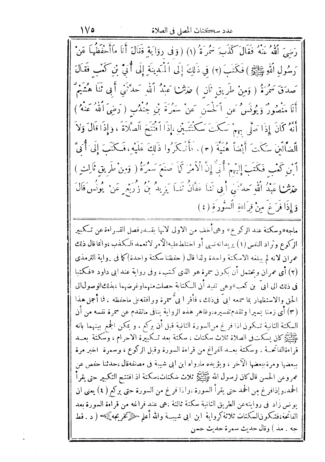 رضي اللهُ عنهُ فقال كذب سُمرةُ (1) (وفى رواية فقال أنا ما أحفظُها عن رسُول الله صلى الله عليه وسلم) فكتب (2) فى ذلك إلى المدينة إلى أبي بن كعب فقال صدق سُمرةُ (ومن طريق ثانٍ) حدثنا عبد الله حدثنى أبى ثنا هُشيم أنا منصُور ويونس عن الحسن عن سمرة بن جُندُب (رضى الله عنهُ) أنَّهُ كان إذا صلَّى بهم سكت سكتتين إذا فتتح الصَّلاة، وإذا قال ولا الضالَّين سكت أيضًا هُنية (3)، فانكروا ذلك عليه، فكتب إلى أبىِّ ابن كعب فكتب إليهم أبى إنَّ الأمر كما صنع سمُرةُ (ومن طريق ثالثٍ) حدثنا عبد الله حدثنى أبى ثنا عفَّانُ ثنا يزيد بن وُريع عن يونس قال وإذا فرغ من قراءة السورة (4)