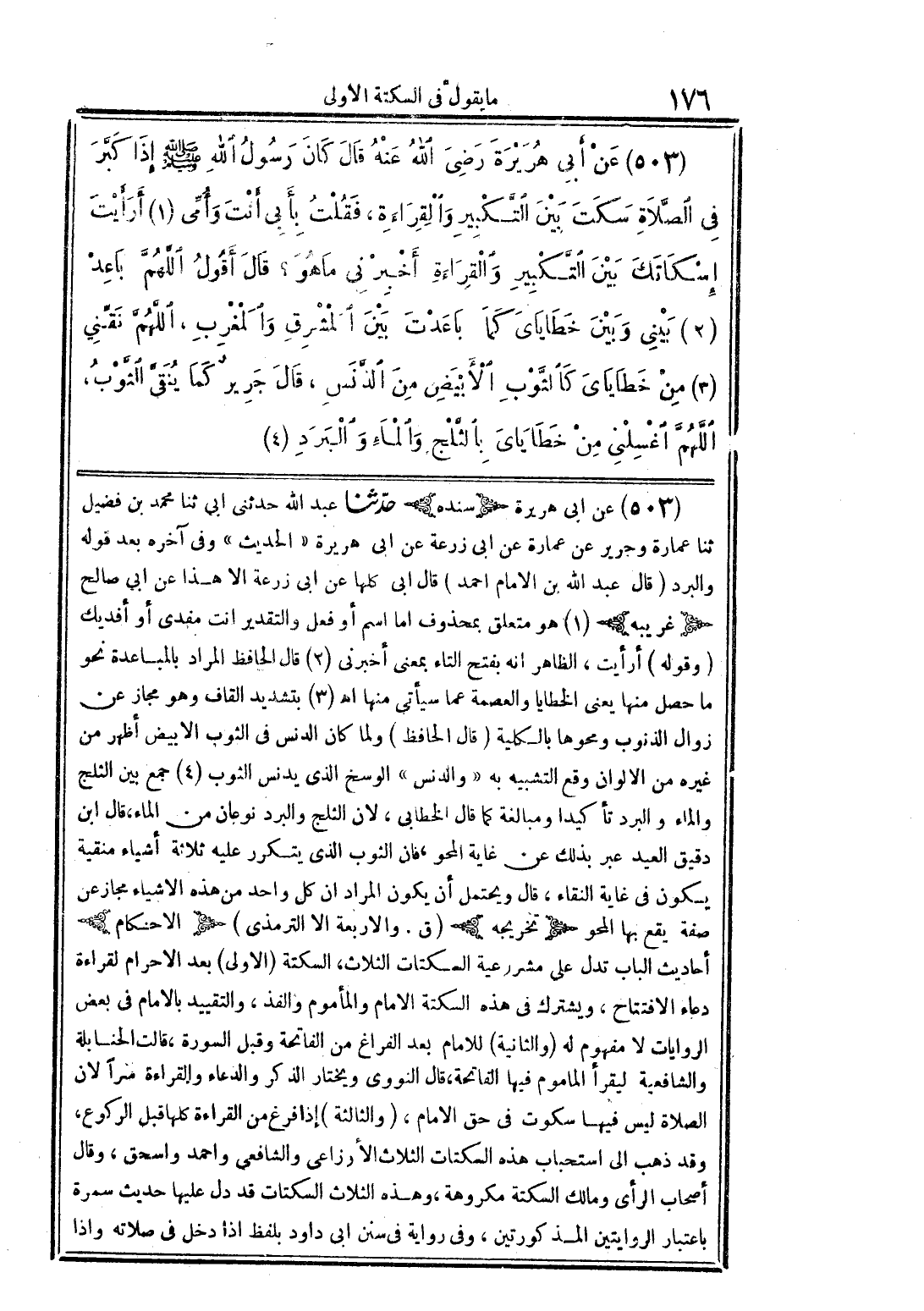 503 عن أبي هريرة (سنده) حدثنا عبد الله حدثني أبي ثنا محمد بن فضيل ثنا عمارة وجرير عن عمارة عن أبي زرعة عن أبي هريرة " الحديث " وفي آخره بعد قوله والبرد (قال عبد الله بن الإمام أحمد) قال أبي كلها عن أبي زرعة إلا هذا عن أبي صالح (غريبه) (1) هو متعلق بمحذوف أما اسم أو فعل والتقدير أنت مفدى أو أفديك (وقوله) أرأيت الظاهر أنه بفتح التاء بمعنى أخبرني (2) قال الحافظ المراد بالمباعدة نحو ما حصل منها يعني الخطايا والعصمة عما سيأتي منها اهـ (3) بتشديد القاف وهو مجاز عن زوال الذنوب ومحوها بالكلية (قال الحافظ) ولما كان الدنس في الثوب الأبيض أظهر من غيره من الألوان وقع التشبيه به " والدنس " الوسخ الذي يدنس الثوب (4) جمع بين الثلج والماء والبرد تأكيداً ومبالغة كما قال الخطابي لأن الثلج والبرد نوعان من الماء قال ابن دقيق العيد عبر بذلك عن غاية المحو فإن الثوب الذي يتكرر عليه ثلاثة أشياء منقية يكون في غاية النقاء قال ويحتمل أن يكون المراد أن كل واحد من هذه الأشياء مجاز عن صفة يقع به المحو (تخريجه) (ق. والأربعة إلا الترمذي) (الأحكام) أحاديث الباب تدل على مشروعية السكتات الثلاث السكتة الأولى بعد الإحرام لقراءة دعاء الافتتاح ويشترك في هذه السكتة الإمام والمأموم والفذ والتقييد بالإمام في بعض الروايات لا مفهوم له (والثانية) للإمام بعد الفراغ من الفاتحة وقبل السورة قالت الحنابلة والشافعية ليقرأ المأمون فيها الفاتحة قال النووي ويختار الذكر والدعاء والقراءة سراً لأن الصلاة ليس فيها سكوت في حق الإمام (والثالثة) إذا فرغ من القراءة كلها قبل الركوع وقد ذه إلى استحباب هذه السكتات الثلاث الأوزاعي والشافعي وأحمد وإسحق وقال أصحاب الرأي ومالك السكتة مكروهة وهذه الثلاث السكتات قد دل عليها حديث سمرة باعتبار الروايتين المذكورتين وفي رواية في سنن أبي داود بلفظ إذا دخل في صلاته وإذا