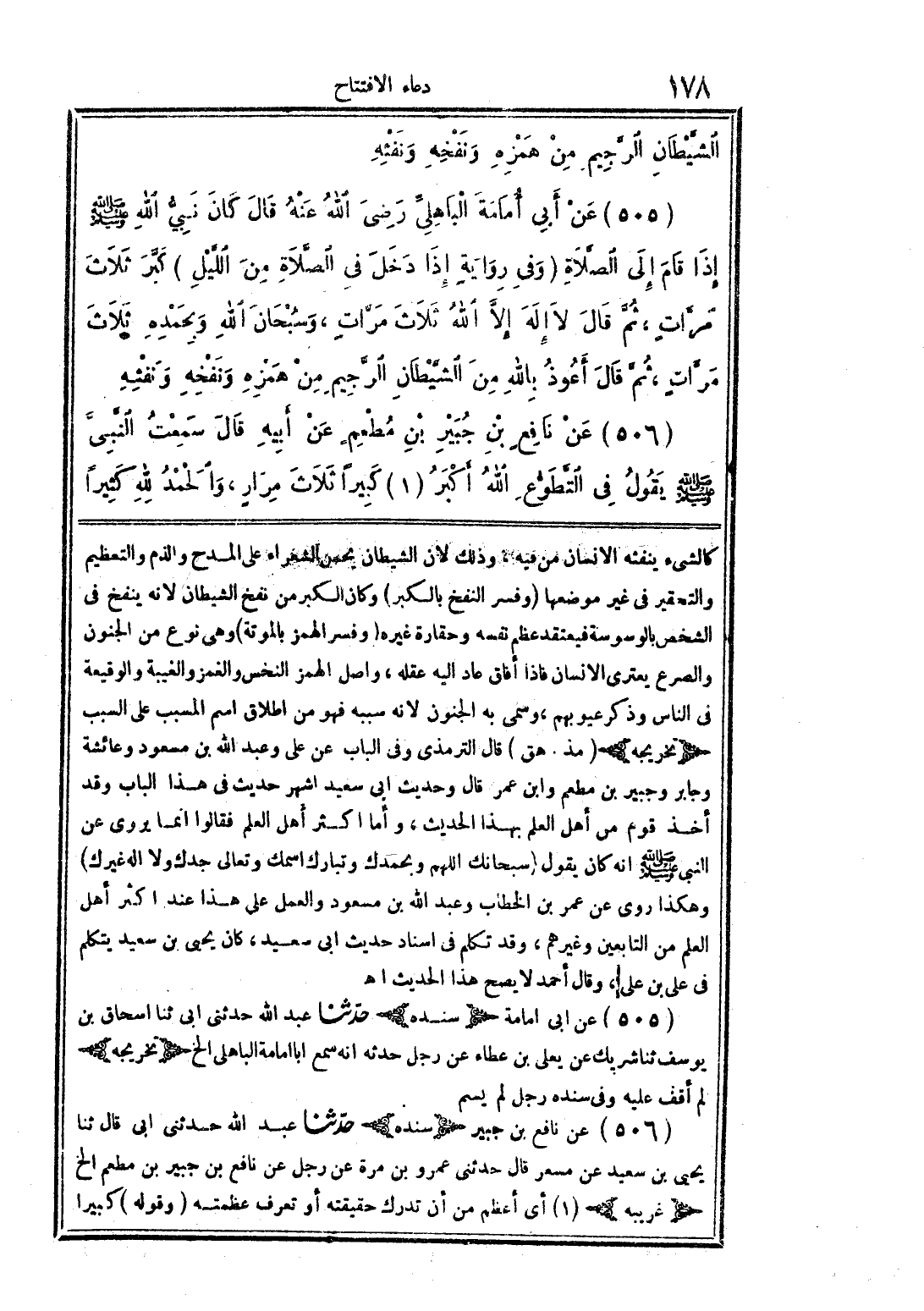 (505) عن أبى أمامة الباهلىِّ رضى الله عنه قال كان نبيُّ الله صلى الله عليه وسلم إذا قام إلى الصَّلاة (وفى رواية إذا دخل فى الصَّلاة من اللَّيل) كبَّر ثلاث مرَّاتٍ، ثمَّ قال لا إله إلاَّ الله ثلاث مرَّاتٍ، وسبحان الله وبحمده ثلاث مرَّاتٍ، ثمَّ قال أعوذ بالله من الشَّيطان الرَّجيم من همزه ونفخه ونفثه