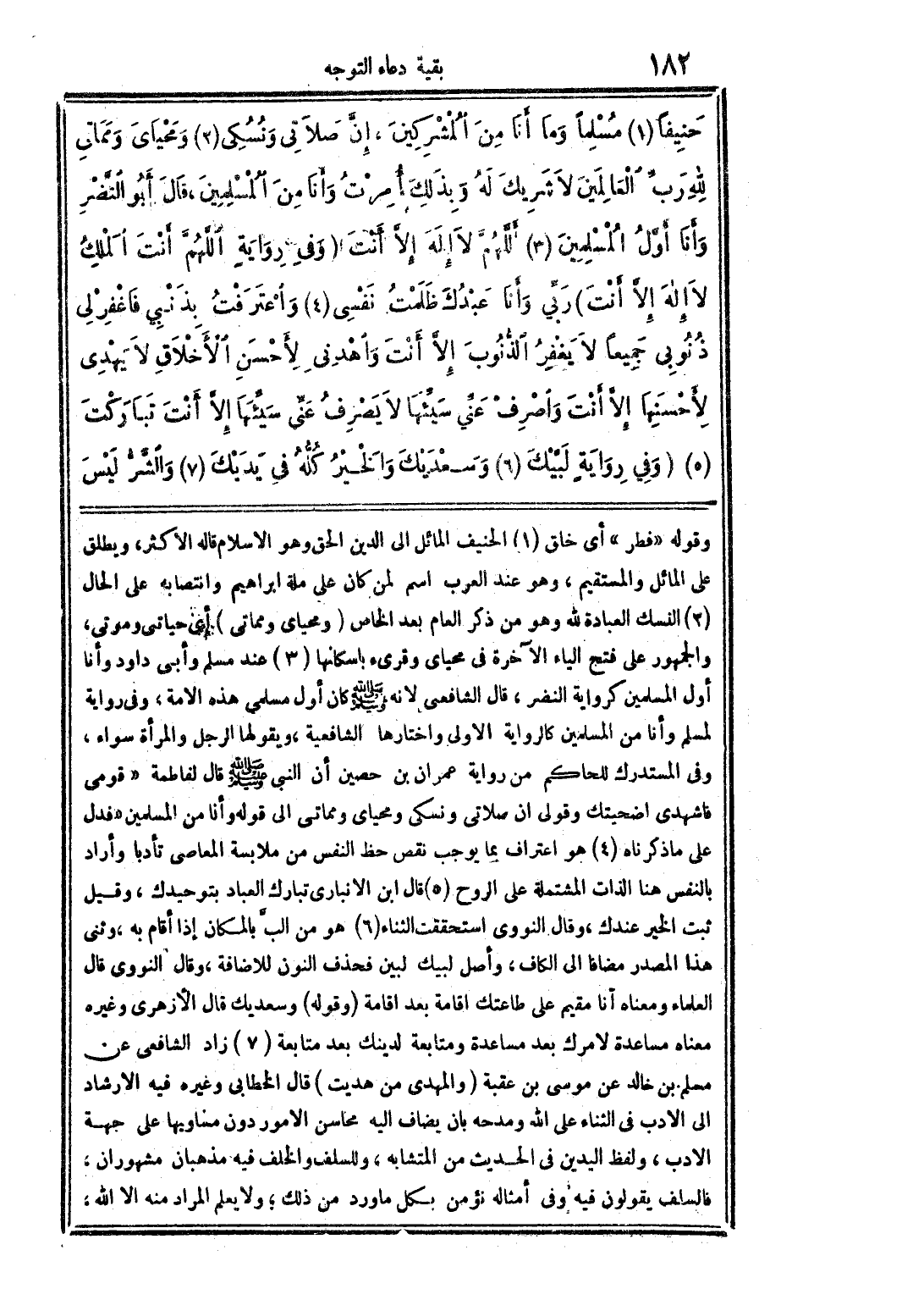 حنيفًا (1) مسلمًا وما أنا من المشركين، إنَّ صلاتى ونسكى (2) ومحياى ومماتى لله ربِّ العالمين لا شريك له وبذلك أمرت وأنا من المسلمين، قال أبو النَّضر وأنا أوَّل المسلمين (3) الَّلهمَّ لا إله إلاَّ أنت (وفى روايةٍ اللَّهمَّ أنت الملك لا إله إلاَّ أنت) ربِّي وأنا عبدك ظلمت نفسى (4) واعترفت بذنبي فاغفرلى ذنوبى جميعًا لا يغفر الذُّنوب إلاَّ أنت واهدنى لأحسن الأخلاق لا يهدى لأحسنها إلاَّ أنت واصرف عنِّي سيِّئها لا يصرف عنِّى سيِّئها إلاَّ أنت تباركت (5) (وفي رواية لبَّيك (6) وسعديك والخير كلُّه فى يديك (7) والشَّرُّ ليس