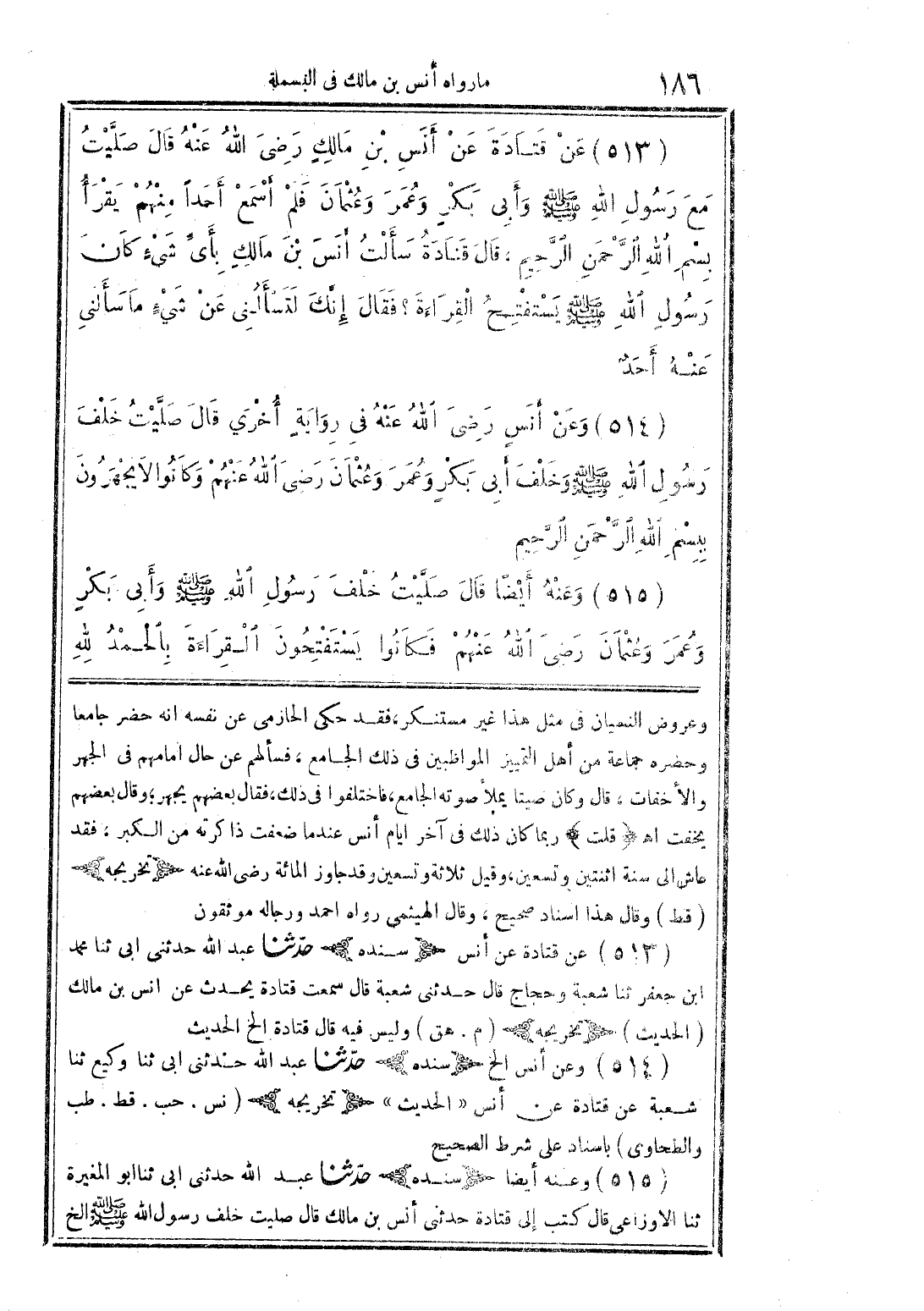 وعروض النسيان في مثل هذا غير مستنكر فقد حكى الحازمي عن نفسه أنه حضر جامعاً وحضره جماعة من أ÷ل التمييز المواظبين في ذلك الجامع فسألهم عن حال أمامهم في الجهر والأخفات قال وكان صيتاً يملأ صوته الجامع فاختلفوا في ذلك فقال بعضهم يجهر وقال بعضهم يخفت اهـ (قلت) رما كان ذلك في آخر أيام أنس عندما ضعفت ذاكرته في الكبر فقد عاش إلى سنة اثنتين وتسعين وقيل ثلاثة وتسعين وقد جاوز المائة رضي الله عنه (تخريجه) (قط) وقال هذا إسناد صحيح وقال الهيثمي رواه أحمد ورجاله موثقون 513 عن قتادة عن أنس (سنده) حدثنا عبد الله حدثني أبي ثنا محمد ابن جعفر ثنا شعبة وحجاج قال حدثني شعبة قال سمعت قتادة يحدث عن أنس بن مالك (الحديث) (تخريجه) (م. هق) وليس فيه قال قتادة الخ الحديث 514 وعن أنس الخ (سنده) حدثنا عبد الله حدثني أبي ثنا وكيع ثنا شعبة عن قتادة عن أنس "الحديث " (تخريجه) (نس. حب. قط. طب والطحاوي) بإسناد على شرط الصحيح 515 وعنه أيضاً (سنده) حدثنا عبد الله حدثني أبي ثنا أبو المغيرة ثنا الأوزاعي قال كتب إلى قتادة حدثني أنس بن مالك قال صليت خلف رسول الله صلى الله عليه وسلم الخ