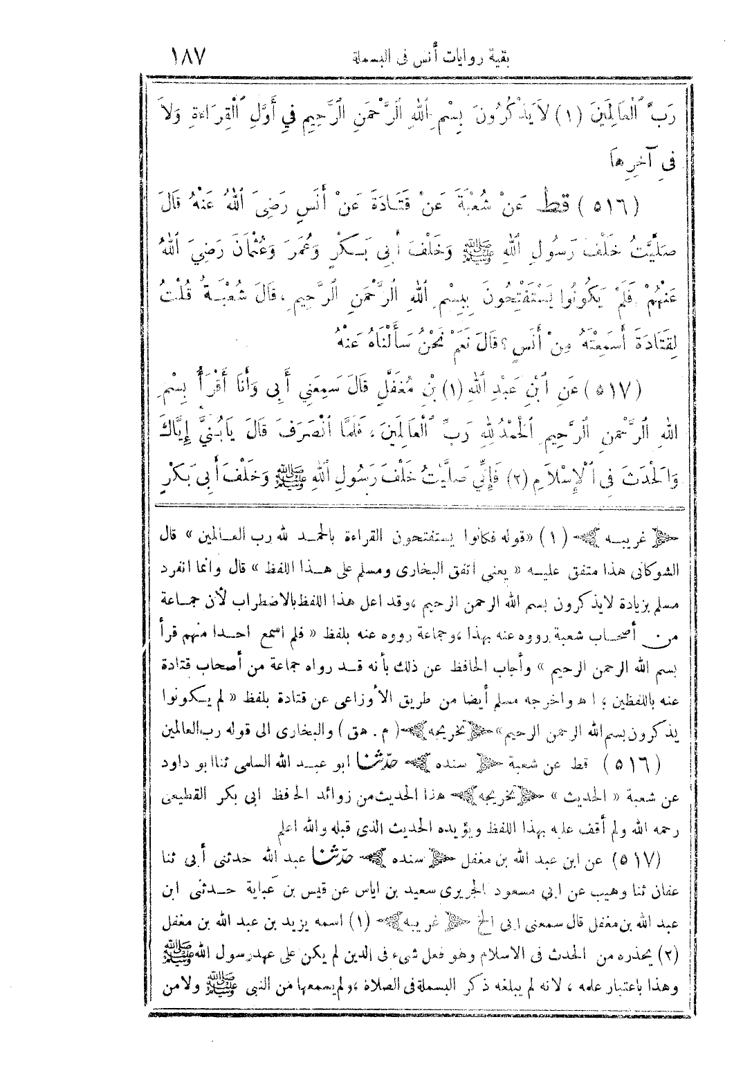 (غريبه) (1) " قوله فكانوا يستفتحون القراءة بالحمد لله رب العالمين " قال الشوكاني هذا متفق عليه " يعني اتفق البخاري ومسلم على هذا اللفظ " قال وإنما انفرد مسلم بزيادة لا يذكرون بسم الله الرحمن الرحيم وقد أعل هذا اللفظ بالاضطراب لأن جماعة من أصحاب شعبة رووه عنه بهذا وجماعة رووه عنه بلفظ " فلم أسمع أحداً منهم قرأ بسم الله الرحمن الرحيم " وأجاب الحافظ عن ذلك بأنه قد رواه جماعة من أصحاب قتادة عنه باللفظين اهـ وأخرجه مسلم أيضاً من طريق الأوزاعي عن قتادة بلفظ " لم يذكرون بسم الله الرحمن الرحيم " (تخريجه) (م. هق) والبخاري إلى قوله رب العالمين 516 قط عن شعبة (سنده) حدثنا أبو عبد الله السلمي ثنا أبو داود عن شعبة ولم أقف عليه بهذا اللفظ ويؤيده الحديث الذي قبله والله أعلم 517 عن ابن عبد الله بن مغفل (سنده) حدثنا عبد الله حدثني أبي ثنا عفان وهيب عن أبي مسعود الجريري سعيد بن إياس عن قيس بن عباية حدثني ابن عبد الله بن مغفل قال سمعني أبي الخ (غريبه) (1) اسمه يزيد بن عبد الله بن مغفل (2) يحذره من الحدث في الإسلام وهو فعل شيء في الدين لم يكن على عهد رسول الله صلى الله عليه وسلم وهذا باعتبار علمه لأنه لم يبلغه ذكر البسملة في الصلاة ولم يسمعها من النبي صلى الله عليه وسلم ولا من