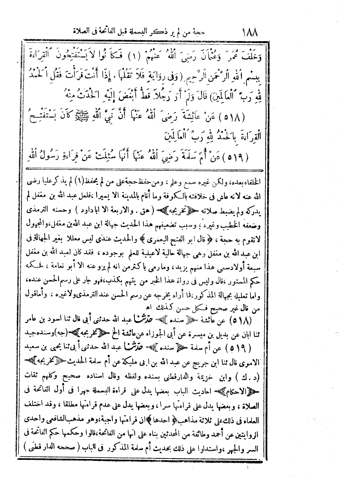 الخلفاء بعده ولكن غيره سمع وعلم ومن حفظ حجة على من لم يحفظ (1) لم يذكر عليا رضي الله عنه لأنه عاش في خلافته بالكوفة وما أقام بالمدينة إلا يسيرا فلعل عبد الله بن مغفل لم يدركه ولم يضبط صلاته (تخريجه) (هق. والأربعة إلا أبا داود) وحسنه الترمذي وضعفه الخطيب وغيره وسبب تضعيفهم هذا الحديث جهالة ابن عبد الله بن مغفل والمجهول لا تقوم به حجة (قال أبو الفتح اليعمري) والحديث عندي ليس معللاً بغير الجهالة في ابن عبد الله بن مغفل وهي جهالة حالية لا عينية للعلم بوجوده فقد كان لعبد الله بن مغفل سبعة أولاد سمي هذا منهم يزيد وما رمى بأكثر من أنه لم يزو عنه إلا أبو نعامة فحكمه حكم المستور قال وليس في رواة هذا الخبر من يتهم بكذب فهو جار على رسم الحسن عنده وأما تعليله بجهالة المذكور ما أراه يخرجه عن رسم الحسن عند الترمذي ولا غيره وأما قول من قال غير صحيح فكل حسن كذلك اهـ 518 عن عائشة (سنده) حدثنا عبد الله حدثني أبي قال ثنا أسود بن عامر ثنا أبان عن بديل بن ميسرة عن أبي الجوزاء عن عائشة الخ (تخريجه) (جه) وسنده جيد 519 عن أم سلمة (سنده) حدثنا عبد الله حدثني أبي ثنا يحيى بن سعيد الأموي قال ثنا ابن جريج عن عبد الله بن أبي مليكة عن أم سلمة الحديث (تخريجه) (د. ك) وابن خزيمة والدارقطني بسنده ولفظه وقال إسناده صحيح وكلهم ثقات (الأحكام) أحاديث الباب بعضها يدل على قراءة البسملة جهراً في أول الفاتحة في الصلاة وبعضها يدل على قراءتها سراً وبعضها يدل على عدم قراءتها مطلقاً وقد اختلف العلماء في ذلك على ثلاثة مذاهب (أحدها) أن قراءتها واجبة وهو مذهب الشافعي وإحدى الروايتين عن أ؛ مد وطائفة من المحدثين بناء على أنها من الفاتحة قالوا وحكمها حكم الفاتحة في السر والجهر واستدلوا على ذلك بحديث أم سلمة المذكور في الباب (صححه الدارقطني)