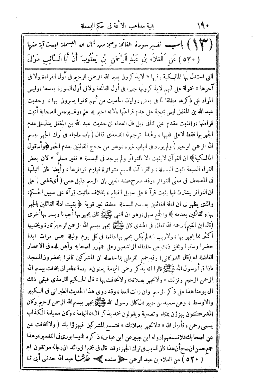 التي استدل بها المالكية وفيها " لا يذكرون بسم الله الرحمن الرحيم في أول القراءة ولا في آخرها " محمولة على أنهم لا يذكرونها جهراً في أول الفاتحة ولا في أول السورة بعدها وليس المراد نفي ذكرها مطلقاً لما في بعض روايات الحديث من أنهم كانوا يسرون بها وحديث عبد الله بن المغفل ليس بحجة على عدم قراءتها لأنه أخبر بما علم وغيره من الصحابة أثبت قراءتها والمثبت مقدم على النافي بل قال العلماء أن حديث عبد الله بن المغفل يدل على عدم الجهر بها فقط لا على نفيها ولهذا ترجم له الترمذي فقال (باب ماجاء في ترك الجهر ببسم الله الرحمن الرحيم) ولم يورد في الباب غيره وهو من حجج القائلين بعدم الجهر (وأما قول المالكية) أن القرآن لا يثبت إلا بالتواتر ولم يوجد في البسملة " فغير مسلم " لأن بعض القراء السبعة أثبت البسملة والقراآت السبع متواترة فيلزم تواترها وأيضاً فإن أثباتها في المصحف في معنى التواتر وقد صرح عضد الدين بأن الرسم دليل علمي (أي قطعي) على أن التواتر يشترط فيما يثبت قرآنا على سبيل القطع بخلاف ما ثبت قرآنا على سبيل الحكم والذي يظهر لي أن أدلة القائلين بعدم البسملة مطلقاً غير قوية (بقيت أدلة القائلين بالجهر بها والقائلين بعدمه) والجمع سهل وهو أن النبي صلى اله عليه وسلم كان يجهر بها أحياناً ويسر بها أخرى قال بان القيم رحمه الله تعالى في الهدى كان صلى الله عليه وسلم يجهر ببسم الله الرحمن الرحيم تارة ويخفيها أكثر مما يجهر بها ولا ريب أنه لم يكن يجهر بها دائماً في كل ليلة خمس مرات أبدا حضراً وسفراً ويخفي ذلك على خلفائه الراشدين وعلى جمهور أصحابه وأهل بلده في الإعصار الفاضلة اهـ (قال الشوكاني) وقد جمع القرطبي بما حاصله أن المشركين كانوا يحضرون المسجد فإذا قرأ رسول الله صلى الله عليه وسلم قالوا أنه يذكر رحمن اليمامة يعنون مسيلمة فأمران يخافت ببسم الله الرحمن الرحيم ونزلت " ولا تجهر بصلاتك ولا تخافت بها " قال الحكيم الترمذي فبقى ذلك إلى يومنا هذا على ذكر الرسم وإن زالت العلة وقد روى هذا الحديث الطبراني في الكبير والأوسط وعن سعيد بن جبير قال كان رسول الله صلى الله عليه وسلم يجهر ببسم الله الرحمن الرحيم وكان المشركون يهزؤن بمكاء وتصدية ويقولون محمد يذكر إله اليمامة وكان مسيلمة الكذاب يسمى رحمن فأنزل الله " ولا تجهر بصلاتك " فتسمع المشركين فيهزؤا بك " ولا تخافت عن أصحابك فلا تسمعهم " رواه ابن جبير عن ابن عباس ذكره النيسابوري في التفسير وهذا جمع حسن أن صح أن هذا كان السبب في ترك الجهر وقد قال في مجمع الزوائد أن رجاله موثقون اهـ 520 عن العلاء بن عبد الرحمن (سنده) حدثنا عبد الله حدثني أبي ثنا