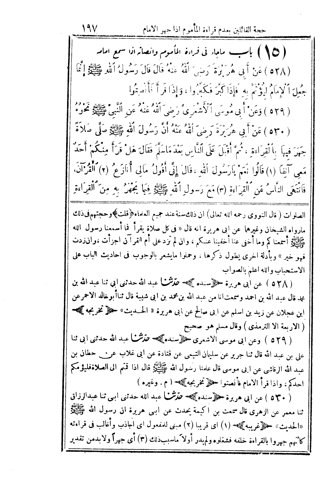 (528) عن أبى هريرة رضى الله عنه قال قال رسول الله صلى الله عليه وسلم إنَّما جعل الإمام ليؤتمَّ به فإذا كبَّر فكربِّروا، وإذا قرأ فأنصتوا