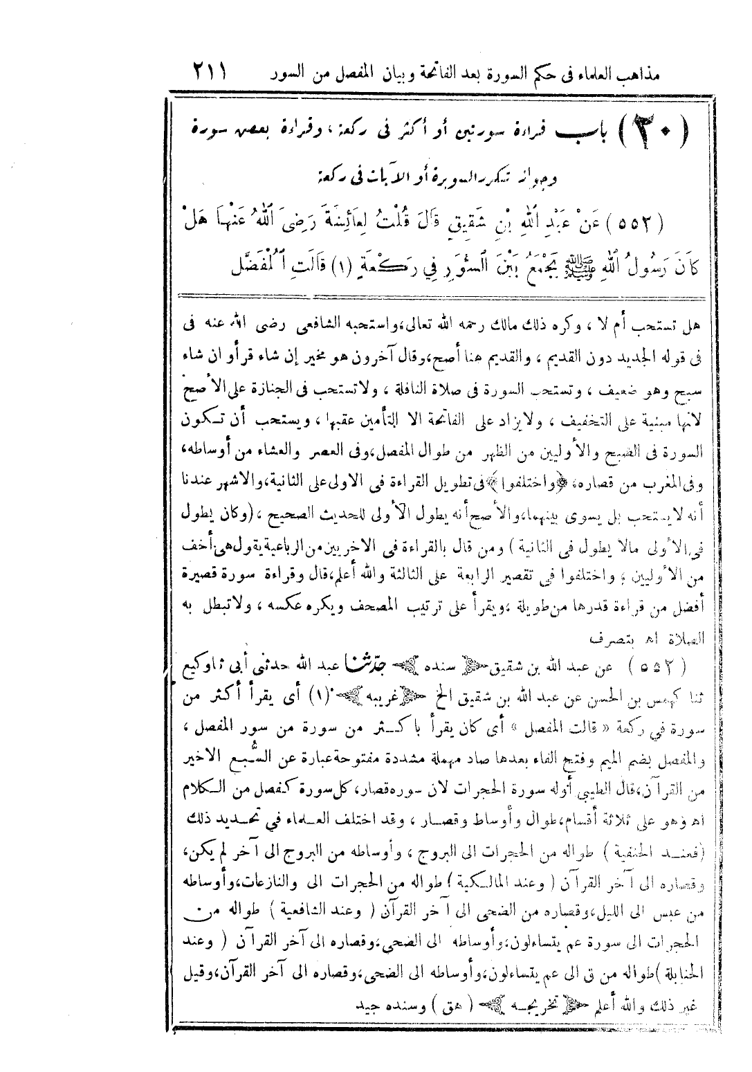 هل تستحب أم لا وكره ذلك مالك رحمه الله تعالى واستحبه الشافعي رضي الله عنه في قوله الجديد دون القديم والقديم هنا أصح وقال آخرون هو مخير إن شاء قرأ وإن شاء سبح وهو ضعيف وتستحب السورة في صلاة النافلة ولا تستحب في الجنازة على الأصح لأنها مبنية على التخفيف ولا يزاد على الفاتحة إلا التأمين عقبها ويستحب أن تكون السورة في الصبح والأوليين من الظهر من طوال المفصل وفي العصر والعشاء من أوساطه وفي المغرب من قصاره (واختلفوا) في تطويل القراءة في الأولى على الثانية والأشهر عندنا أنه لا يستحب بل يسوى بينهما والأصح أنه يطول الأولى للحديث الصحيح (وكان يطول في الأولى مالا يطول في الثانية) ومن قال بالقراءة في الأخريين من الرباعية يقول هي أخف من الأوليين واختلفوا في تقصير الرابعة على الثالثة والله أعلم قال وقراءة سورة قصيرة أفضل من قراءة قدرها من طويلة ويقرأ على ترتيب المصحف ويكره عكسه ولا تبطل به الصلاة اهـ بتصرف 552 عن عبد الله بن شقيق (سنده) حدثنا عبد الله حدثني أبي ثنا وكيع ثنا كهمس بن الحسن عن عبد الله بن شقيق الخ (غريبه) (1) أي يقرأ أكثر من سورة في الركعة " قالت المفصل " أي كان يقرأ بأكثر من سورة من سور المفصل والمفصل بضم الميم وفتح الفاء بعدها صاد مهملة مشددة مفتوحة عبارة عن السبع الأخير من القرآن قال الطيبي أوله سورة الحجرات لأن سورة قصار كل سورة كفصل من الكلام اهـ وهو على ثلاثة أقسام طوال وأوساط وقصار وقد اختلف العلماء في تحديث ذلك (فعند الحنفية) طواله من الحجرات إلى البروج وأوساطه من البروج إلى آخر لم يكن وقصاره إلى آخر القرآن (وعند المالكية " طواله من الحجرات إلى والنازعات وأوساطه من عبس إلى الليل وقصاره من الضحى إلى آخر القرآن (وعند الشافعية) طواله من الحجرات إلى سورة عم يتساءلون وأوساطه إلى الضحى وقصاره إلى آخر القرآن (وعند الحنابلة) طواله من ق إلى عم يتساءلون وأوساطه إلى الضحى وقصاره إلى آخر القرآن وقيل غير ذلك والله أعلم (تخريجه) (هق) وسنده جيد