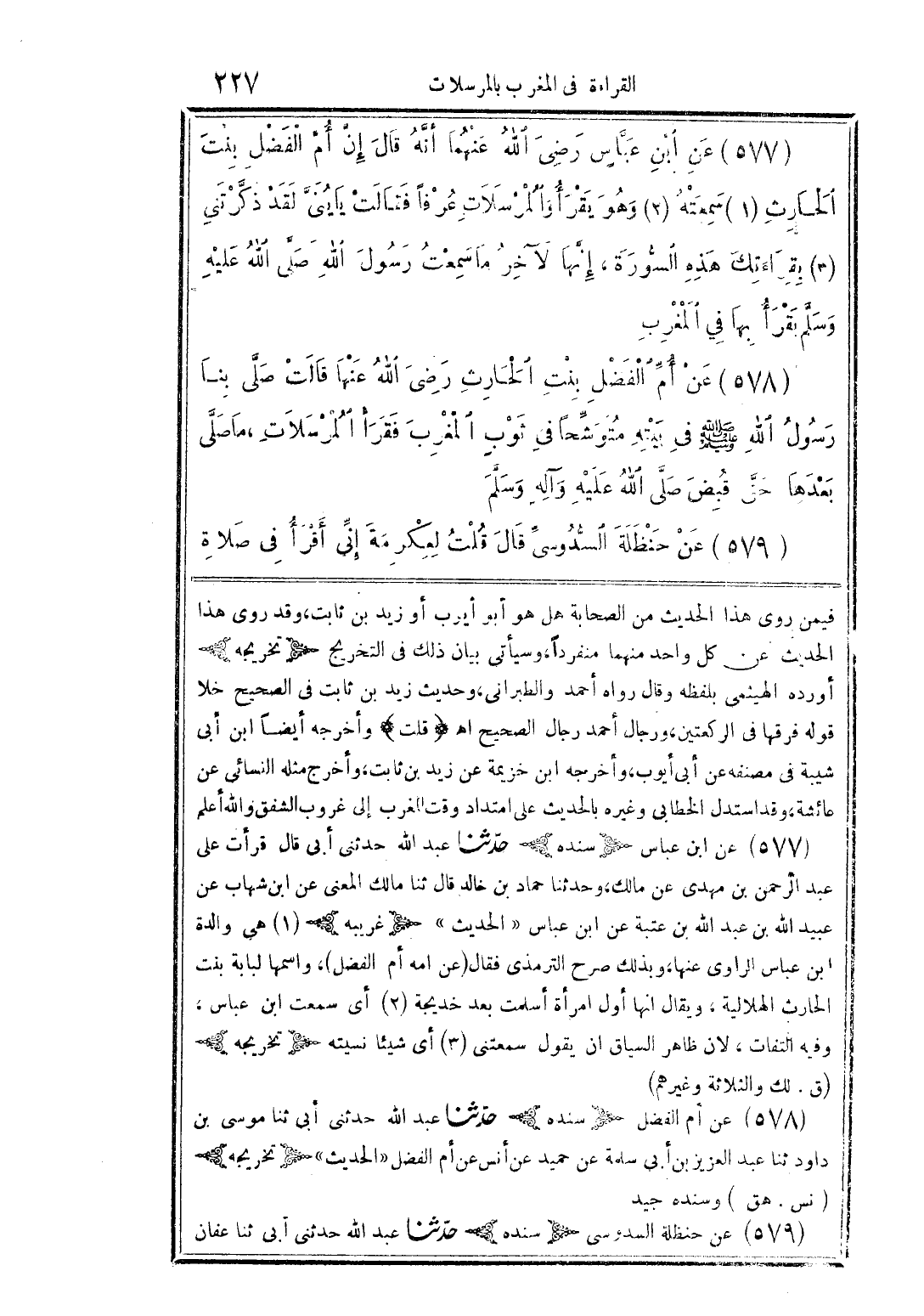 (577) عن ابن عبَّاسٍ رضى الله عنهما أنَّه قال إنَّ أمِّ الفضل بنت الحارث (1) سمعته (2) وهو يقرأ والمرسلات عرفًا فقالت يا بنىَّ لقد ذكَّرتنى (3) بقراءتك هذه السوُّرة، إنَّها لآخر ما سمعت رسول الله صلَّى الله عليه وسلَّم يقرأ بها في المغرب