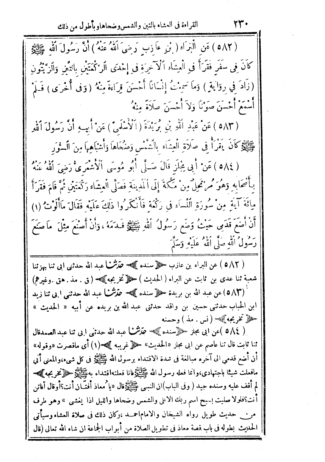 (582) عن البراء (بن عازبٍ رضى الله عنه) أنَّ رسول الله صلى الله عليه وسلم كان فى سفرٍ فقرأ فى العشاء الآخرة فى إحدى الرَّكعتين بالتِّين والزَّيتون (زاد فى روايةٍ) وما سمعت إنسانًا أحسن قراءةً منه (وفى أخرى) فلم أسمع أحسن صوتًا ولا أحسن صلاةً منه