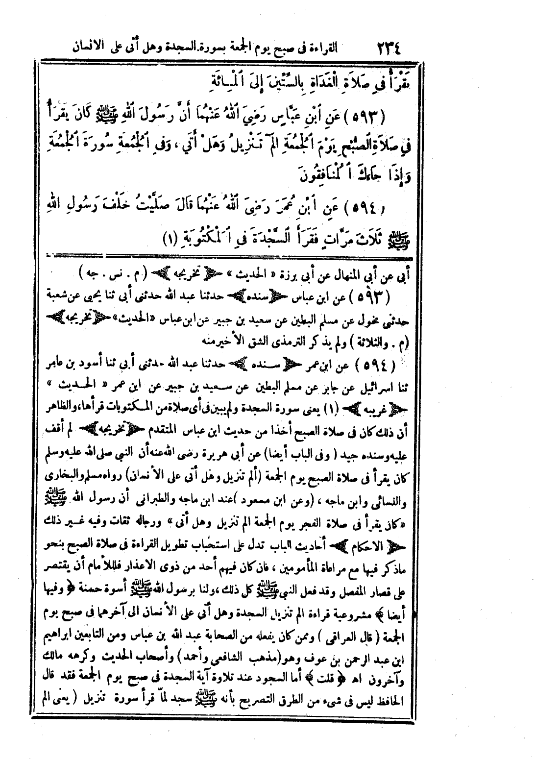 (593) عن ابن عبَّاسٍ رضي الله عنهما أنَّ رسول الله صلى الله عليه وسلم كان يقرأ في صلاة الصُّبح يوم الجمعة الم~ تنزيل وهل أتي، وفى الجمعة سورة الجمعة وإذا جاءك المنافقون