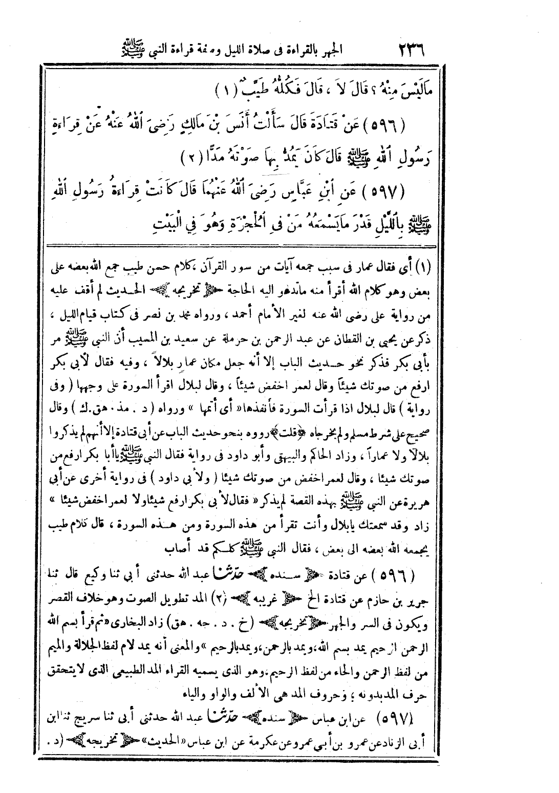 (596) عن قتادة قال سألت نس بن مالكٍ رضى الله عنه عن قراءة رسول الله صلى الله عليه وسلم قال كان يمدُّ بها صوته مدًّا (2)